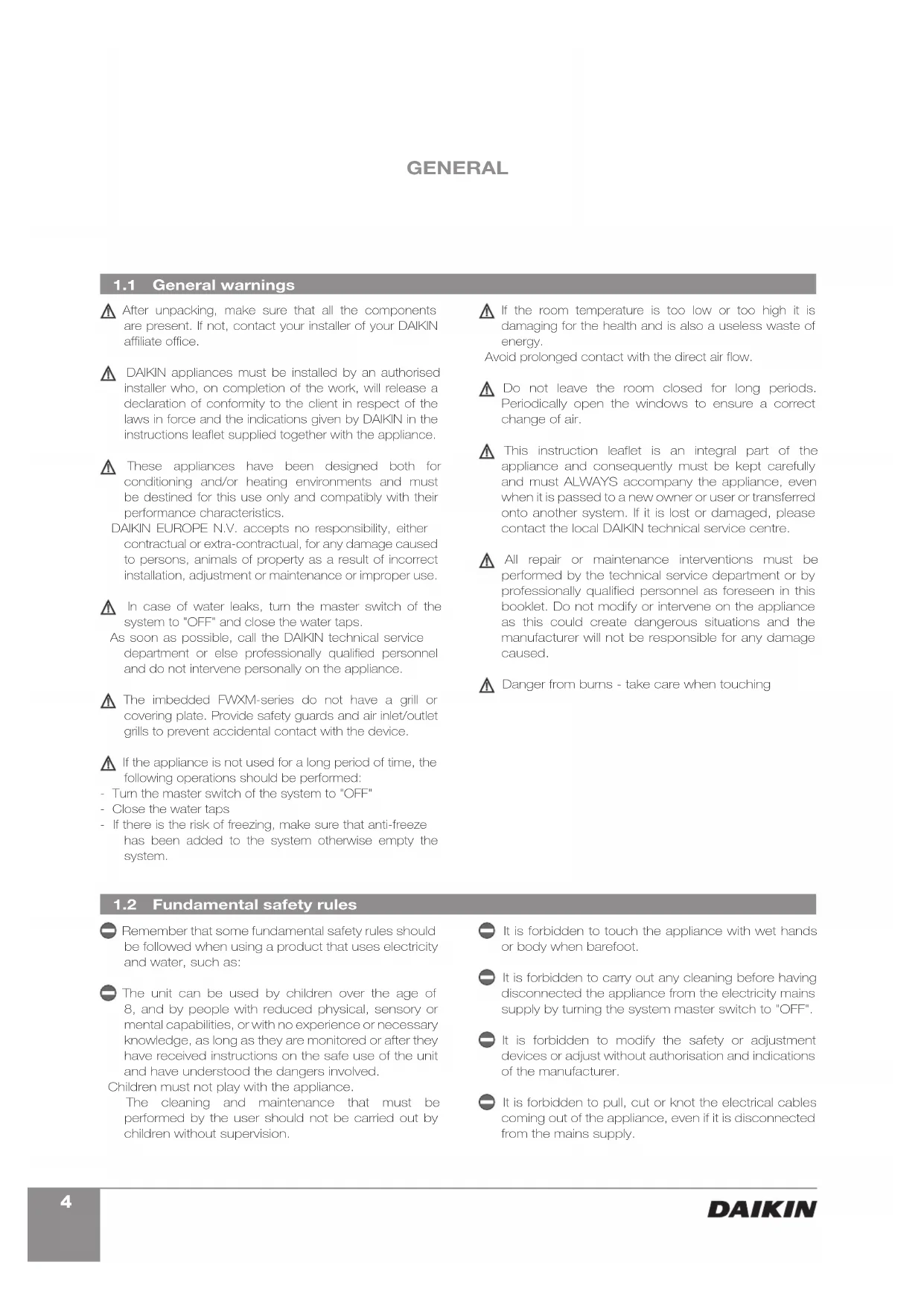 General warnings Fundamental safety rules After unpacking, make sure that all the components are present. If not, contact your installer of your DAIKIN affiliate office. DAIKIN appliances must be installed by an authorised installer who, on completion of the work, will release a declaration of conformity to the client in respect of the laws in force and the indications given by DAIKIN in the instructions leaflet supplied together with the appliance. These appliances have been designed both for conditioning and/or heating environments and must be destined for this use only and compatibly with their performance characteristics. DAIKIN EUROPE N.V. accepts no responsibility, either contractual or extra-contractual, for any damage caused to persons, animals of property as a result of incorrect installation, adjustment or maintenance or improper use. In case of water leaks, turn the master switch of the system to "OFF" and close the water taps. As soon as possible, call the DAIKIN technical service department or else professionally qualified personnel and do not intervene personally on the appliance. The imbedded FWXM-series do not have a grill or covering plate. Provide safety guards and air inlet/outlet grills to prevent accidental contact with the device. If the appliance is not used for a long period of time, the following operations should be performed: - Turn the master switch of the system to "OFF" - Close the water taps - If there is the risk of freezing, make sure that anti-freeze has been added to the system otherwise empty the system. If the room temperature is too low or too high it is damaging for the health and is also a useless waste of energy. Avoid prolonged contact with the direct air flow. Do not leave the room closed for long periods. Periodically open the windows to ensure a correct change of air. This instruction leaflet is an integral part of the appliance and consequently must be kept carefully and must ALWAYS accompany the appliance, even when it is passed to a new owner or user or transferred onto another system. If it is lost or damaged, please contact the local DAIKIN technical service centre. All repair or maintenance interventions must be performed by the technical service department or by professionally qualified personnel as foreseen in this booklet. Do not modify or intervene on the appliance as this could create dangerous situations and the manufacturer will not be responsible for any damage caused. Danger from burns - take care when touching Remember that some fundamental safety rules should be followed when using a product that uses electricity and water, such as: The unit can be used by children over the age of 8, and by people with reduced physical, sensory or mental capabilities, or with no experience or necessary knowledge, as long as they are monitored or after they have received instructions on the safe use of the unit and have understood the dangers involved. Children must not play with the appliance. The cleaning and maintenance that must be performed by the user should not be carried out by children without supervision. It is forbidden to touch the appliance with wet hands or body when barefoot. It is forbidden to carry out any cleaning before having disconnected the appliance from the electricity mains supply by turning the system master switch to "OFF". It is forbidden to modify the safety or adjustment devices or adjust without authorisation and indications of the manufacturer. It is forbidden to pull, cut or knot the electrical cables coming out of the appliance, even if it is disconnected from the mains supply. GENERAL5