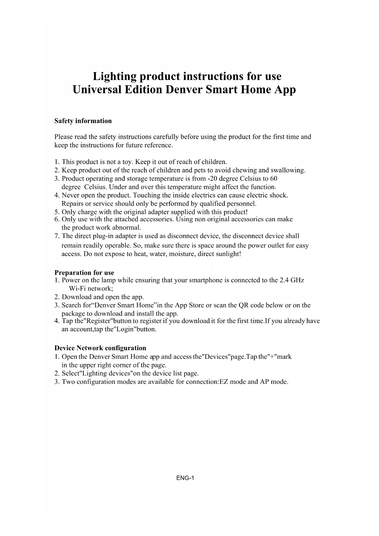 1 2 3ENG-1 Lighting product instructions for use Universal Edition Denver Smart Home App Safety information Please read the safety instructions carefully before using the product for the first time and keep the instructions for future reference.