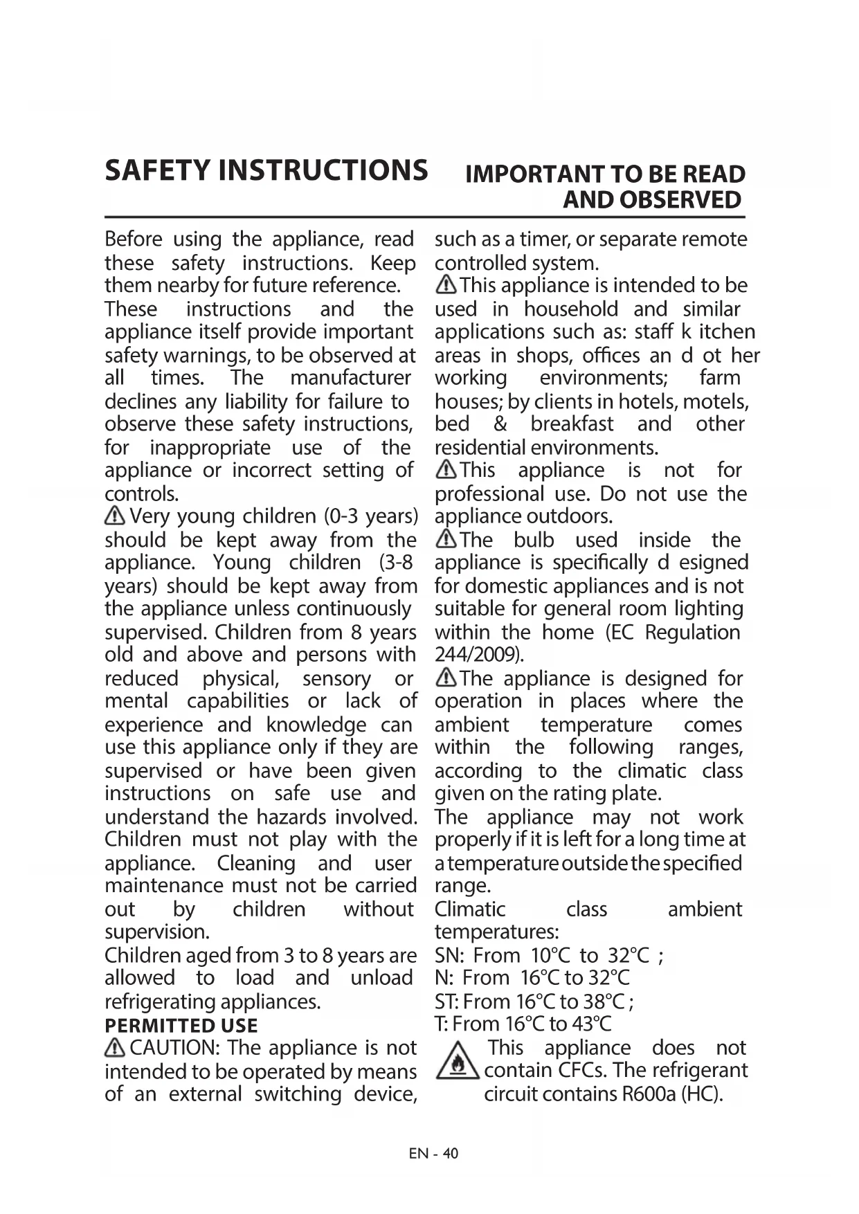 ontrolled system. This appliance is intended to be used in household and similar applications such as: sta k itchen areas in shops, oces an d ot her working environments; farm houses; by clients in hotels, motels, bed & breakfast and other residential environments. This appliance is not for professional use. Do not use the appliance outdoors. The bulb used inside the appliance is specically d esigned for domestic appliances and is not suitable for general room lighting within the home (EC Regulation 244/2009). The appliance is designed for operation in places where the ambient temperature comes within the following ranges, according to the climatic class given on the rating plate. The appliance may not work properly if it is left for a long time at a temperature outside the specied range. Climatic class ambient temperatures: SN: From 10°C to 32°C ; N: From 16°C to 32°C ST: From 16°C to 38°C ; T: From 16°C to 43°C This appliance does not contain CFCs. The refrigerant circuit contains R600a (HC).EN -