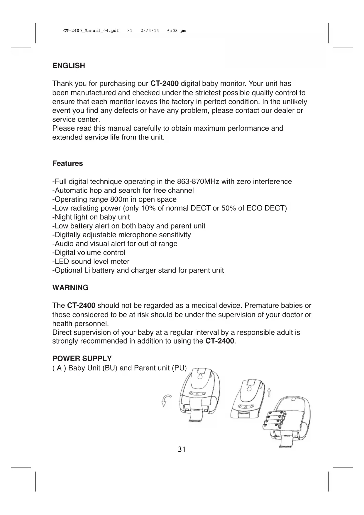 Thank you for purchasing our CT-2400 digital baby monitor. Your unit has been manufactured and checked under the strictest possible quality control to ensure that each monitor leaves the factory in perfect condition. In the unlikely event you find any defects or have any problem, please contact our dealer or service center.
