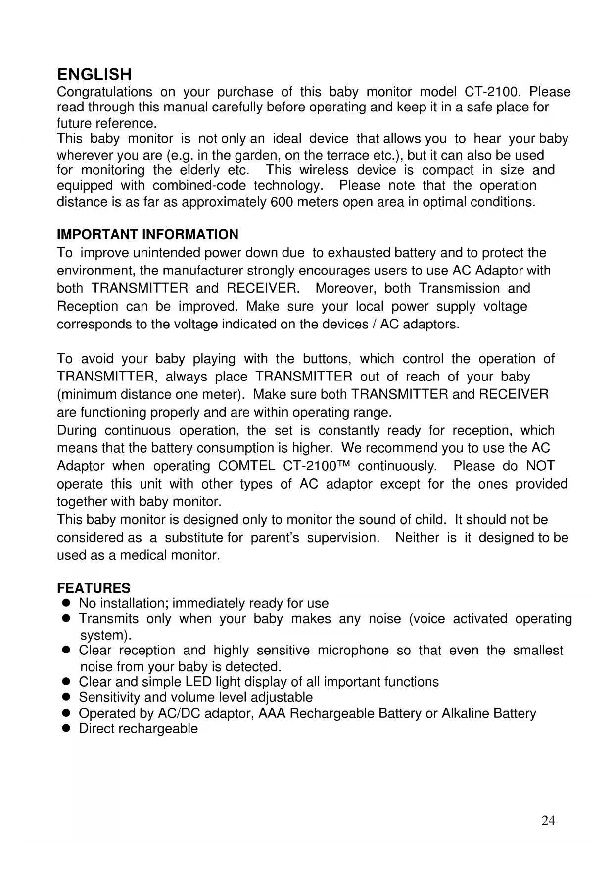 Congratulations on your purchase of this baby monitor model CT-2100. Please read through this manual carefully before operating and keep it in a safe place for future reference.