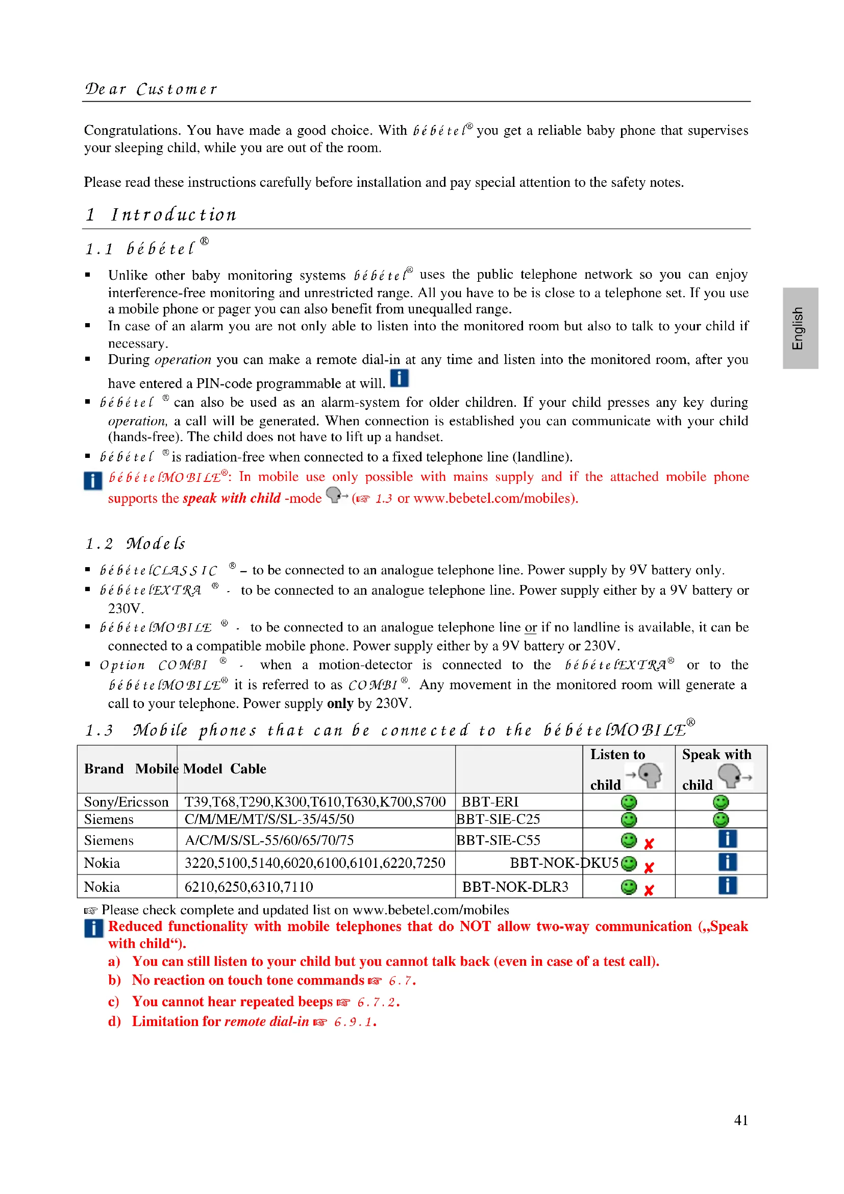 1 bébé telMOBI LÉ: In mobile use only possible with mains supply and if the attached mobile phone supports the speak with child -mode (1.3 or www.bebetel.com/mobiles).