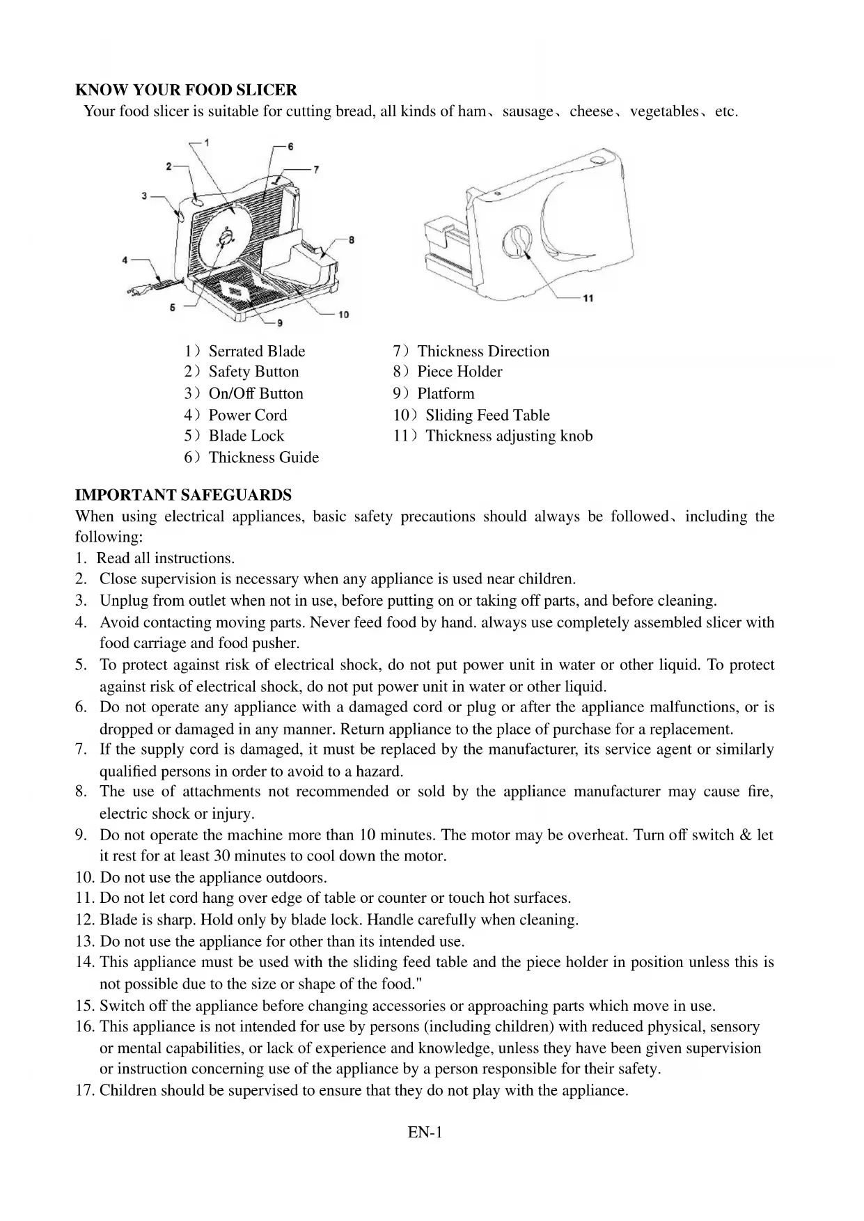 EN-3Cheese Chill thoroughly before slicing. Cover with foil to keep moist. Before serving, allow cheese to reach room temperature – this enhances the natural flavor. Cold Cuts Cold cuts keep longer and retain flavour if sliced as needed. For best results, chill first. Remove any plastic or hard casing before slicing. Use a constant, gentle pressure for uniform slices. Vegetables and Fruits Your slicer is “made to order” for slicing many vegetables and fruits including potatoes、tomatoes、 carrots、cabbage (for slaw)、eggplant、squash and zucchini. Potatoes may be sliced thick for casseroles or thin for chips. Fresh pineapple may be sliced neatly. Cut off top and slice to order. Breads、Cakes and Cookies Freshly baked bread should be cooled before slicing. Use day-old or slightly stale bread for extra-thin slices for toasting. Your slicer is ideal for all types of party breads, pound cake and fruit cake. For wafer-like ice box cookies, chill dough in refrigerator and slice as desired. GUARANTEE Not covered by this guarantee: damage arising from improper use (operation with incorrect current/voltage, plugging it into unsuitable power point, breakage), normal wear and defects, which have a negligible effect on the value or operation of the appliance. The guarantee becomes void, if repairs are undertaken by unauthorized persons and of original parts are not used. Technical data Operating voltage: 220-240V~50Hz Power consumption: 100Watt