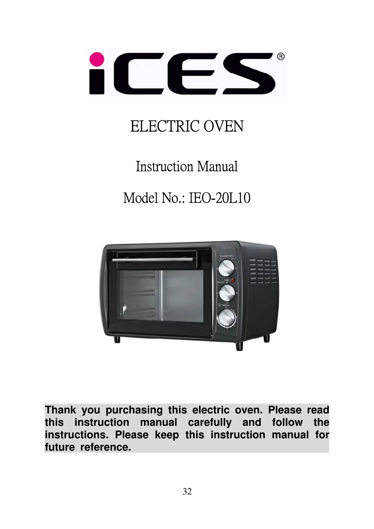Thank you purchasing this electric oven. Please read this instruction manual carefully and follow the instructions. Please keep this instruction manual for future reference.33