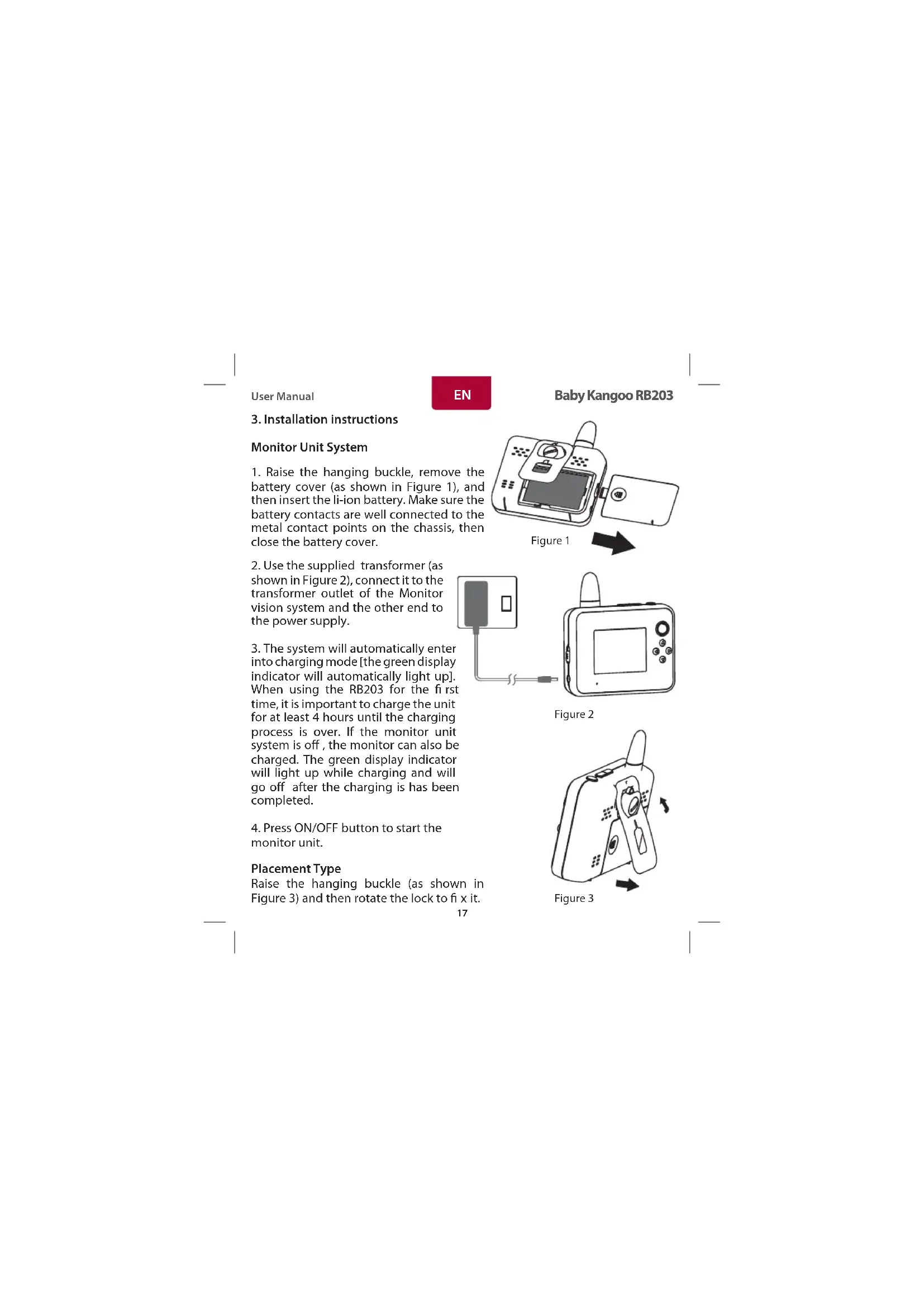 - The system will automatically enter into charging mode [the green display indicator will automatically light up]. When using the RB203 for the first time, it is important to charge the unit for at least 4 hours until the charging process is over. If the monitor unit system is off, the monitor can also be charged. The green display indicator will light up while charging and will go off after the charging is has been completed.