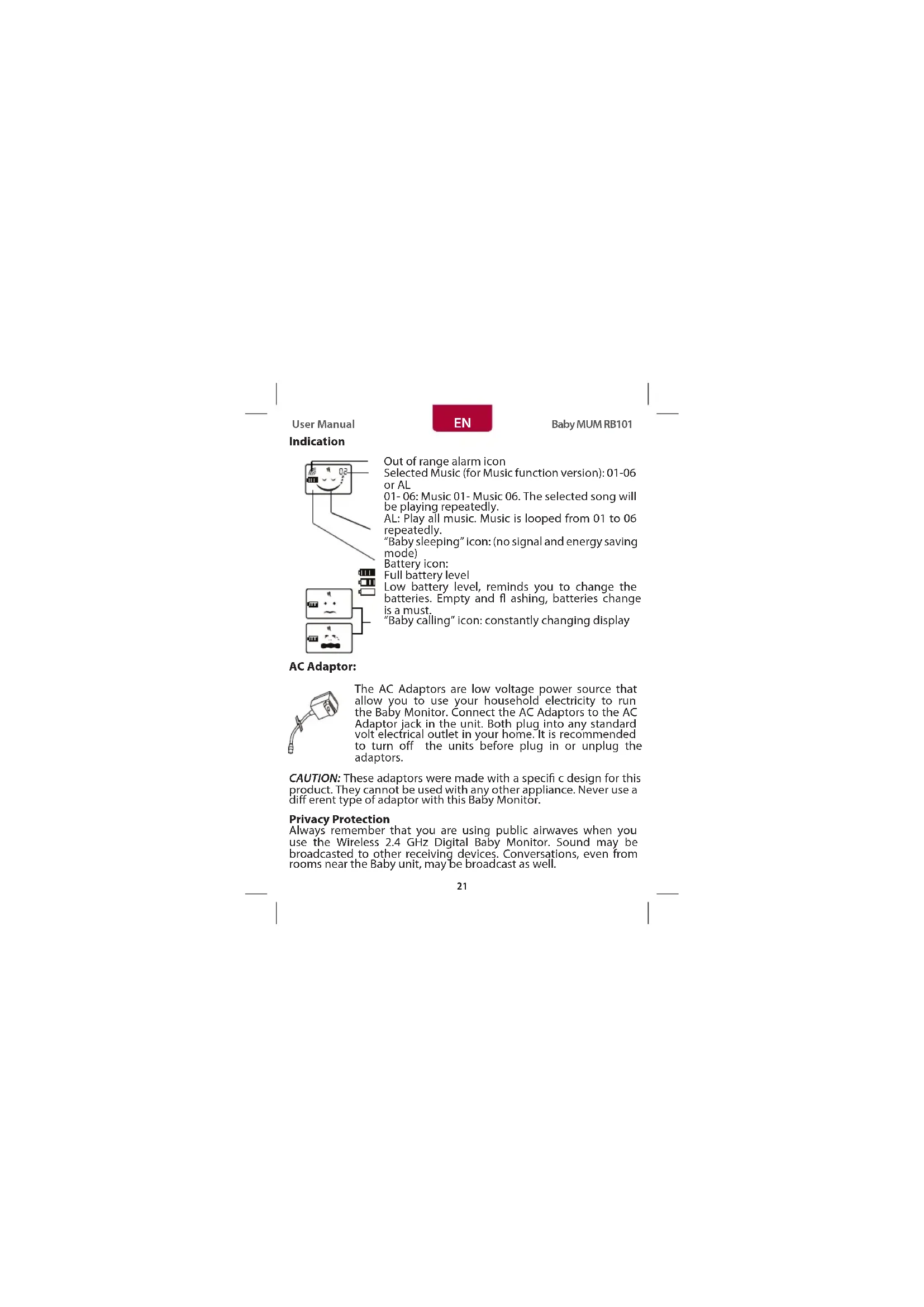 AL:Play all music.Music is looped from 01 to 06 repeatedly. "Baby sleeping"icon:(no signal and energy saving mode) Battery icon: Full battery level Low battery level,reminds you to change the batteries. Empty and fl ashing,batteries change is a must. "Baby calling"icon:constantly changing display