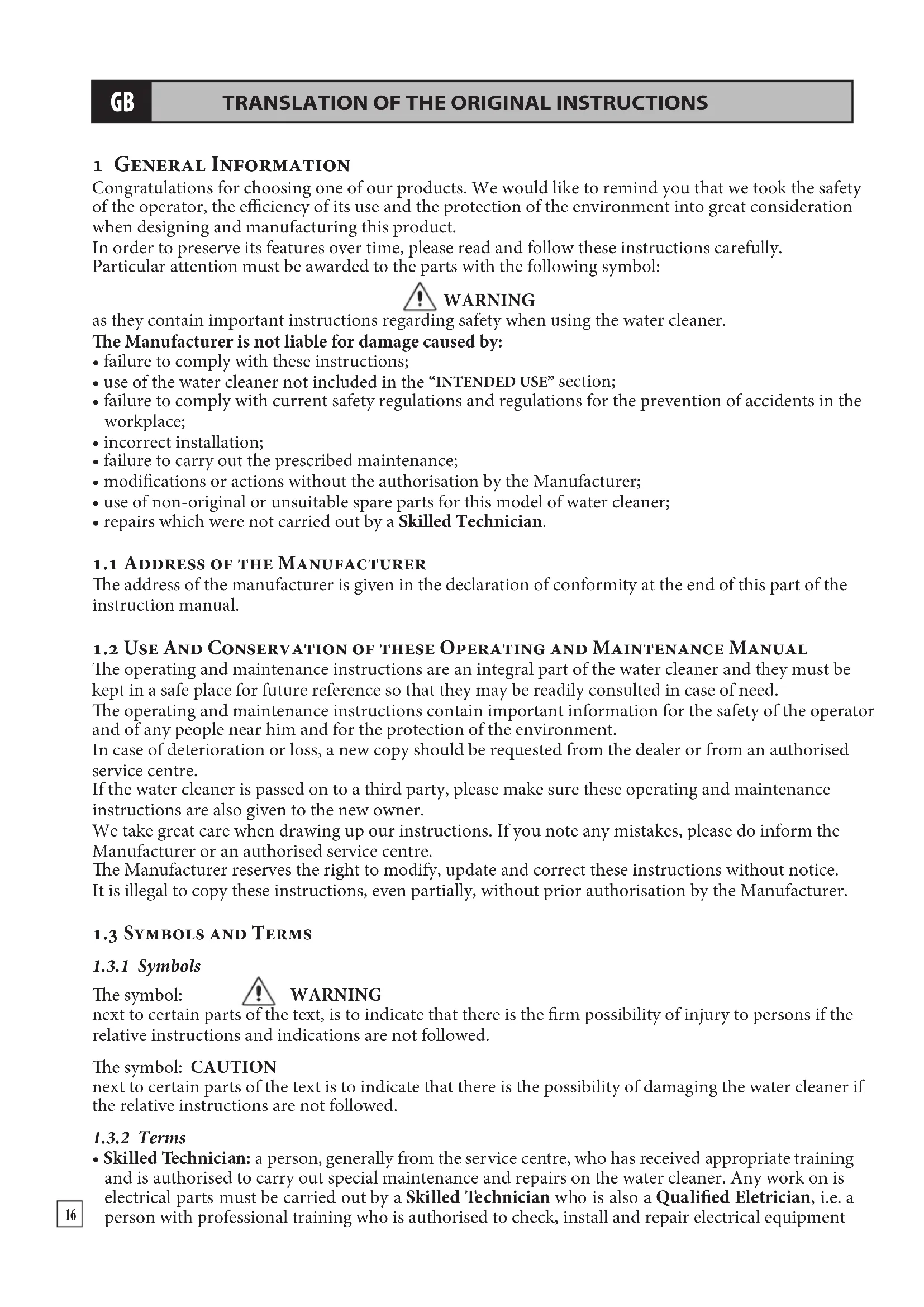 - Skilled Technician: a person, generally from the service centre, who has received appropriate training and is authorised to carry out special maintenance and repairs on the water cleaner. Any work on is electrical parts must be carried out by a Skilled Technician who is also a Qualified Elettrician, i.e. a person with professional training who is authorised to check, install and repair electrical equipment
