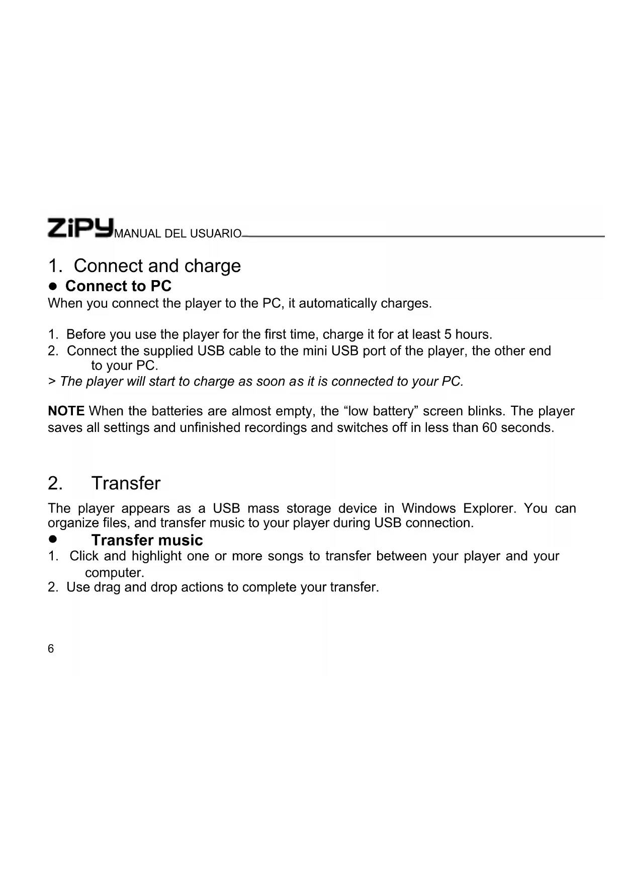 z Connect to PC When you connect the player to the PC, it automatically charges.