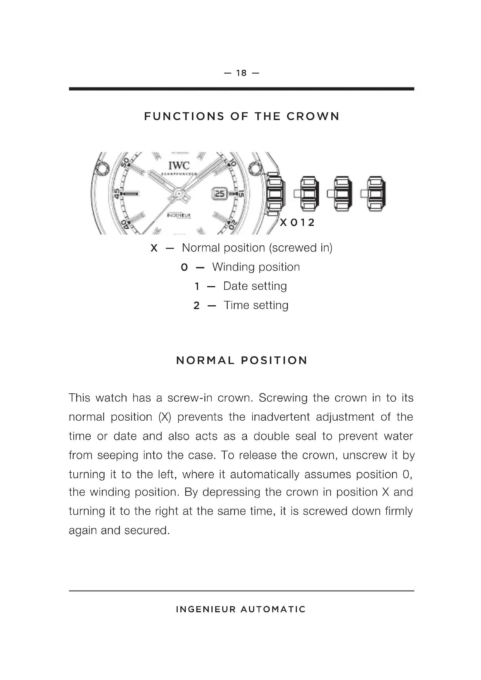 This watch has a screw-in crown. Screwing the crown in to its normal position (X) prevents the inadvertent adjustment of the time or date and also acts as a double seal to prevent water from seeping into the case. To release the crown, unscrew it by turning it to the left, where it automatically assumes position 0, the winding position. By depressing the crown in position X and turning it to the right at the same time, it is screwed down firmly again and secured.
