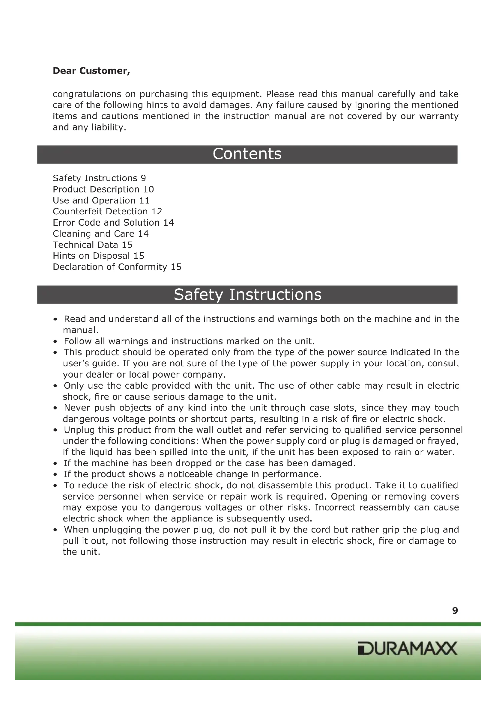 Dear Customer, congratulations on purchasing this equipment. Please read this manual carefully and take care of the following hints to avoid damages. Any failure caused by ignoring the mentioned items and cautions mentioned in the instruction manual are not covered by our warranty and any liability. Contents Safety Instructions 9 Product Description 10 Use and Operation 11 Counterfeit Detection 12 Error Code and Solution 14 Cleaning and Care 14 Technical Data 15 Hints on Disposal 15 Declaration of Conformity 15 Safety Instructions
