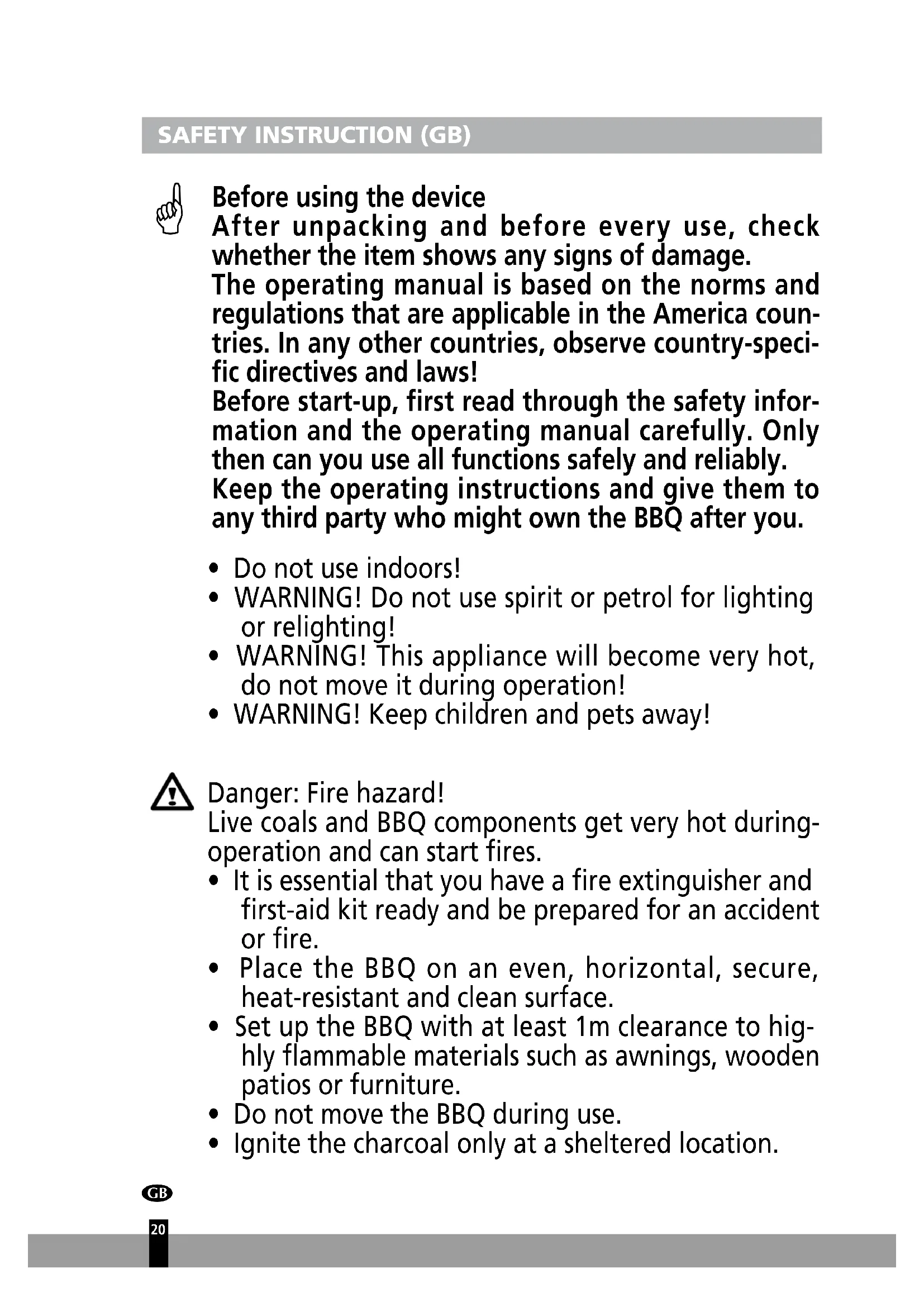 Before using the device After unpacking and before every use, check whether the item shows any signs of damage. The operating manual is based on the norms and regulations that are applicable in the America coun- tries. In any other countries, observe country-speci- fic directives and laws! Before start-up, first read through the safety infor- mation and the operating manual carefully. Only then can you use all functions safely and reliably. Keep the operating instructions and give them to any third party who might own the BBQ after you.