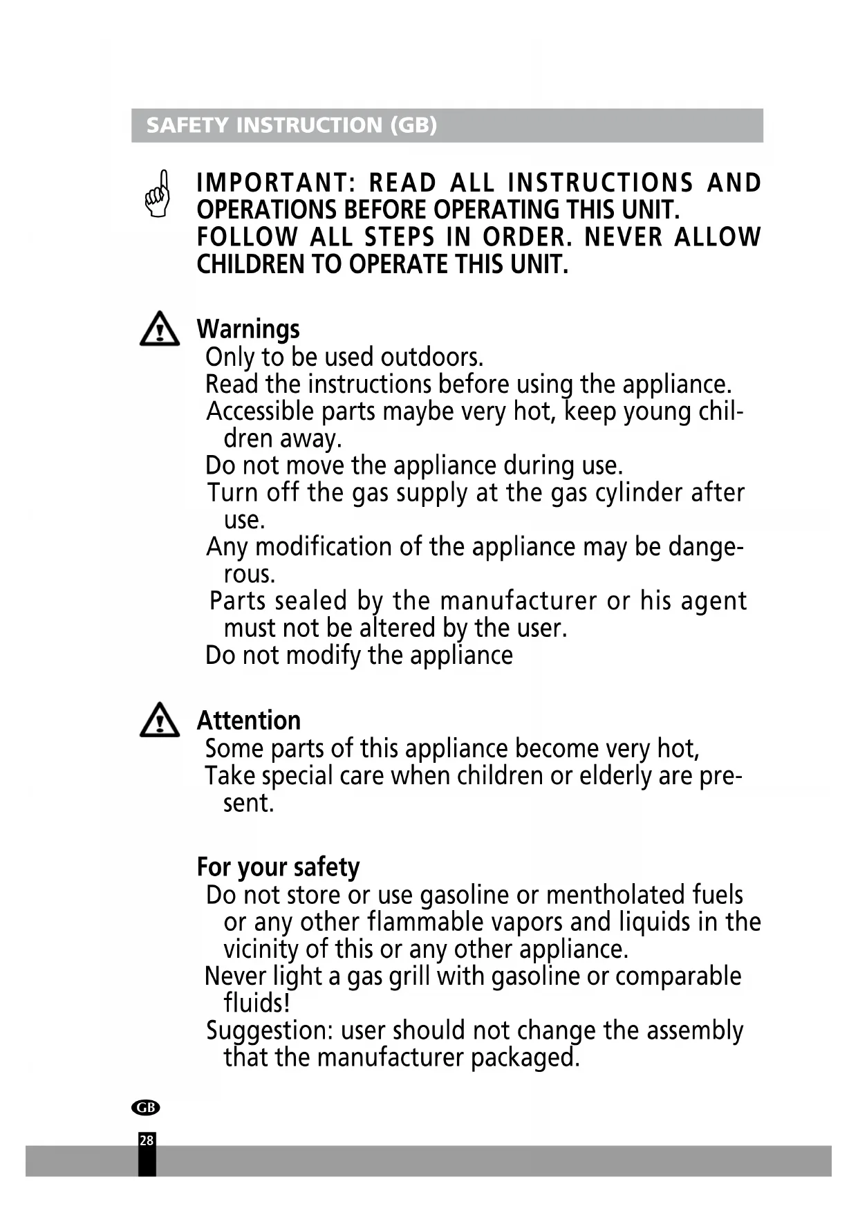 OPERATIONS BEFORE OPERATING THIS UNIT. FOLLOW ALL STEPS IN ORDER. NEVER ALLOW CHILDREN TO OPERATE THIS UNIT. Warnings Only to be used outdoors. Read the instructions before using the appliance. Accessible parts maybe very hot, keep young chil- dren away. Do not move the appliance during use. Turn off the gas supply at the gas cylinder after use. Any modification of the appliance may be dange- rous. Parts sealed by the manufacturer or his agent must not be altered by the user. Do not modify the appliance Attention Some parts of this appliance become very hot, Take special care when children or elderly are pre- sent. For your safety Do not store or use gasoline or mentholated fuels or any other flammable vapors and liquids in the vicinity of this or any other appliance. Never light a gas grill with gasoline or comparable fluids! Suggestion: user should not change the assembly that the manufacturer packaged.