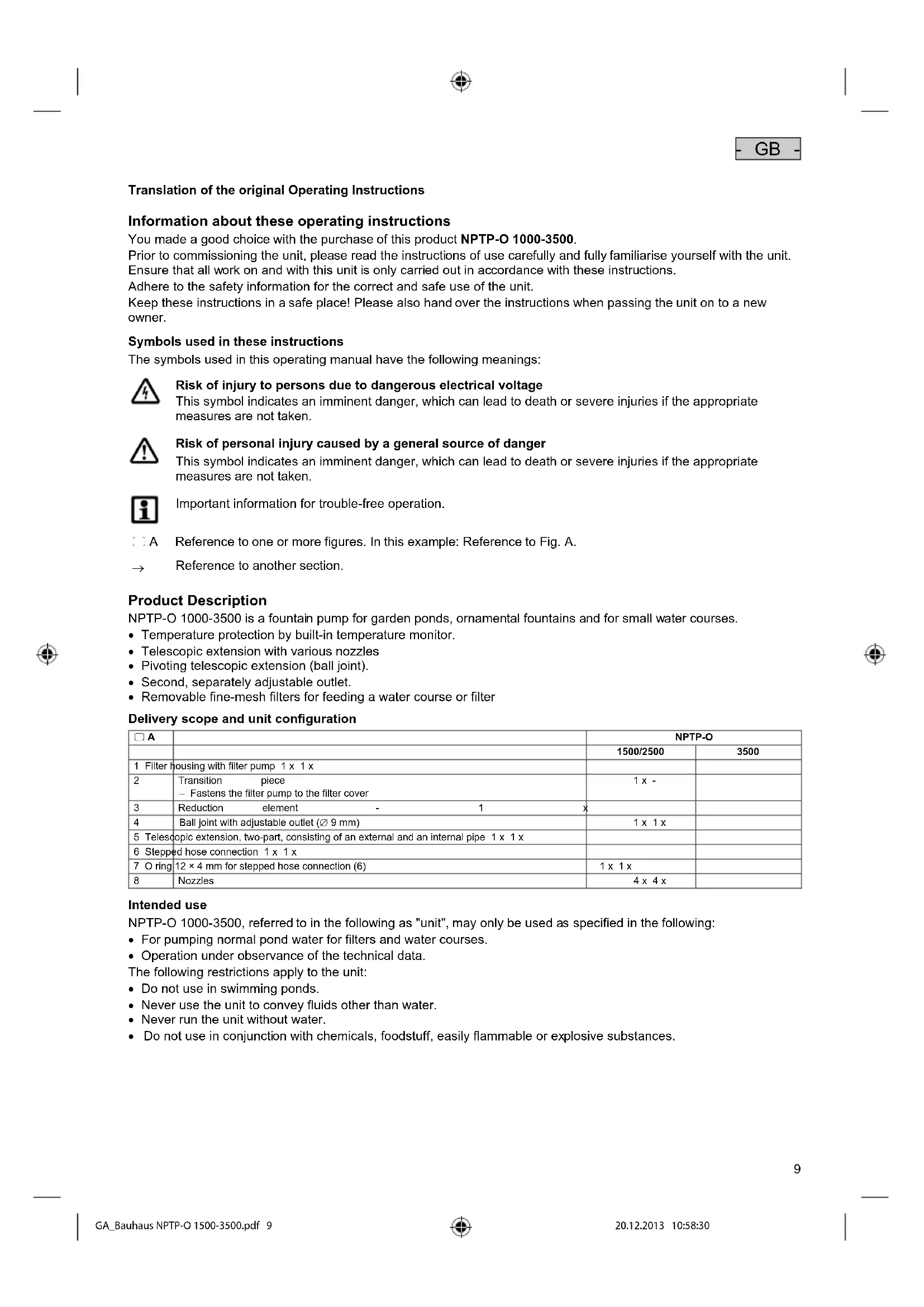 GA_Bauhaus NPTP-O 1500-3500.pdf 8 20.12.2013 10:58:309 - GB - Translation of the original Operating Instructions Information about these operating instructions You made a good choice with the purchase of this product NPTP-O 1000-3500. Prior to commissioning the unit, please read the instructions of use carefully and fully familiarise yourself with the unit. Ensure that all work on and with this unit is only carried out in accordance with these instructions. Adhere to the safety information for the correct and safe use of the unit. Keep these instructions in a safe place! Please also hand over the instructions when passing the unit on to a new owner. Symbols used in these instructions The symbols used in this operating manual have the following meanings: