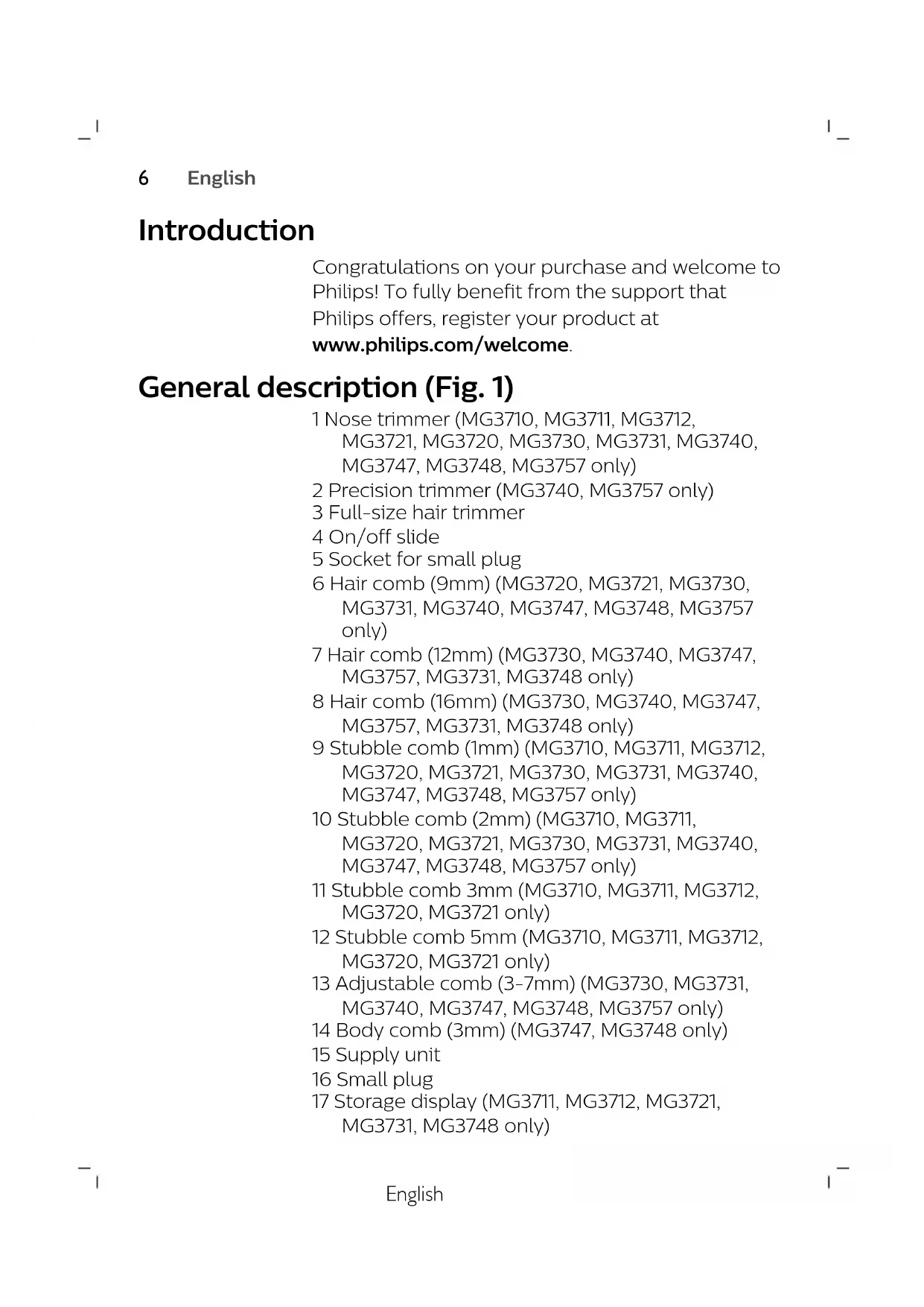 182English Introduction Congratulations on your purchase and welcome to Philips! To fully benefit from the support that Philips offers, register your product at www.philips.com/welcome. General description (Fig. 1) 1 Nose trimmer (MG3710, MG3711, MG3712, MG3721, MG3720, MG3730, MG3731, MG3740, MG3747, MG3748, MG3757 only) 2 Precision trimmer (MG3740, MG3757 only) 3 Full-size hair trimmer 4 On/off slide 5 Socket for small plug 6 Hair comb (9mm) (MG3720, MG3721, MG3730, MG3731, MG3740, MG3747, MG3748, MG3757 only) 7 Hair comb (12mm) (MG3730, MG3740, MG3747, MG3757, MG3731, MG3748 only) 8 Hair comb (16mm) (MG3730, MG3740, MG3747, MG3757, MG3731, MG3748 only) 9 Stubble comb (1mm) (MG3710, MG3711, MG3712, MG3720, MG3721, MG3730, MG3731, MG3740, MG3747, MG3748, MG3757 only) 10 Stubble comb (2mm) (MG3710, MG3711, MG3720, MG3721, MG3730, MG3731, MG3740, MG3747, MG3748, MG3757 only) 11 Stubble comb 3mm (MG3710, MG3711, MG3712, MG3720, MG3721 only) 12 Stubble comb 5mm (MG3710, MG3711, MG3712, MG3720, MG3721 only) 13 Adjustable comb (3-7mm) (MG3730, MG3731, MG3740, MG3747, MG3748, MG3757 only) 14 Body comb (3mm) (MG3747, MG3748 only) 15 Supply unit 16 Small plug 17 Storage display (MG3711, MG3712, MG3721, MG3731, MG3748 only)