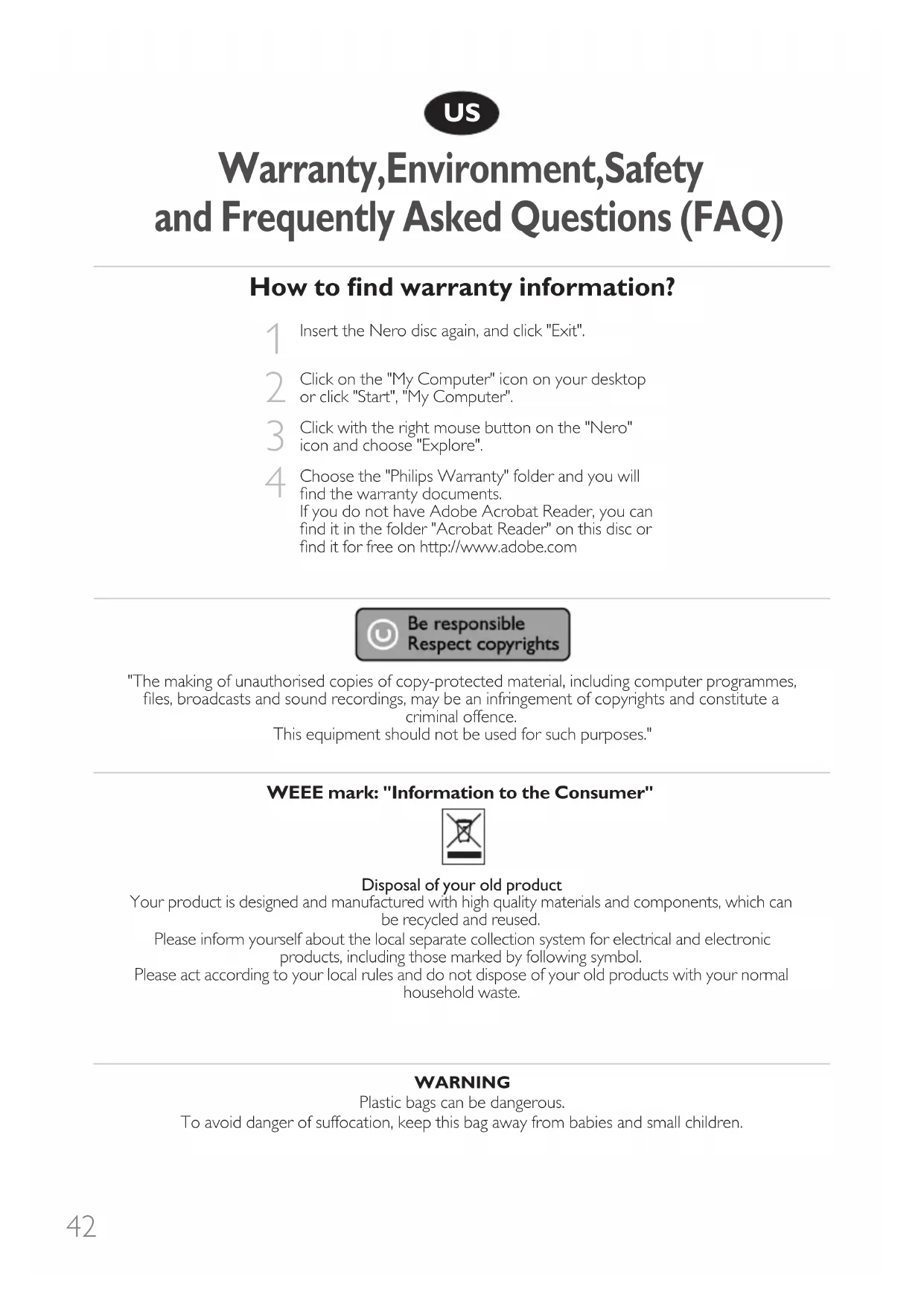 Warranty, Environment, Safety and Frequently Asked Questions (FAQ) 42
