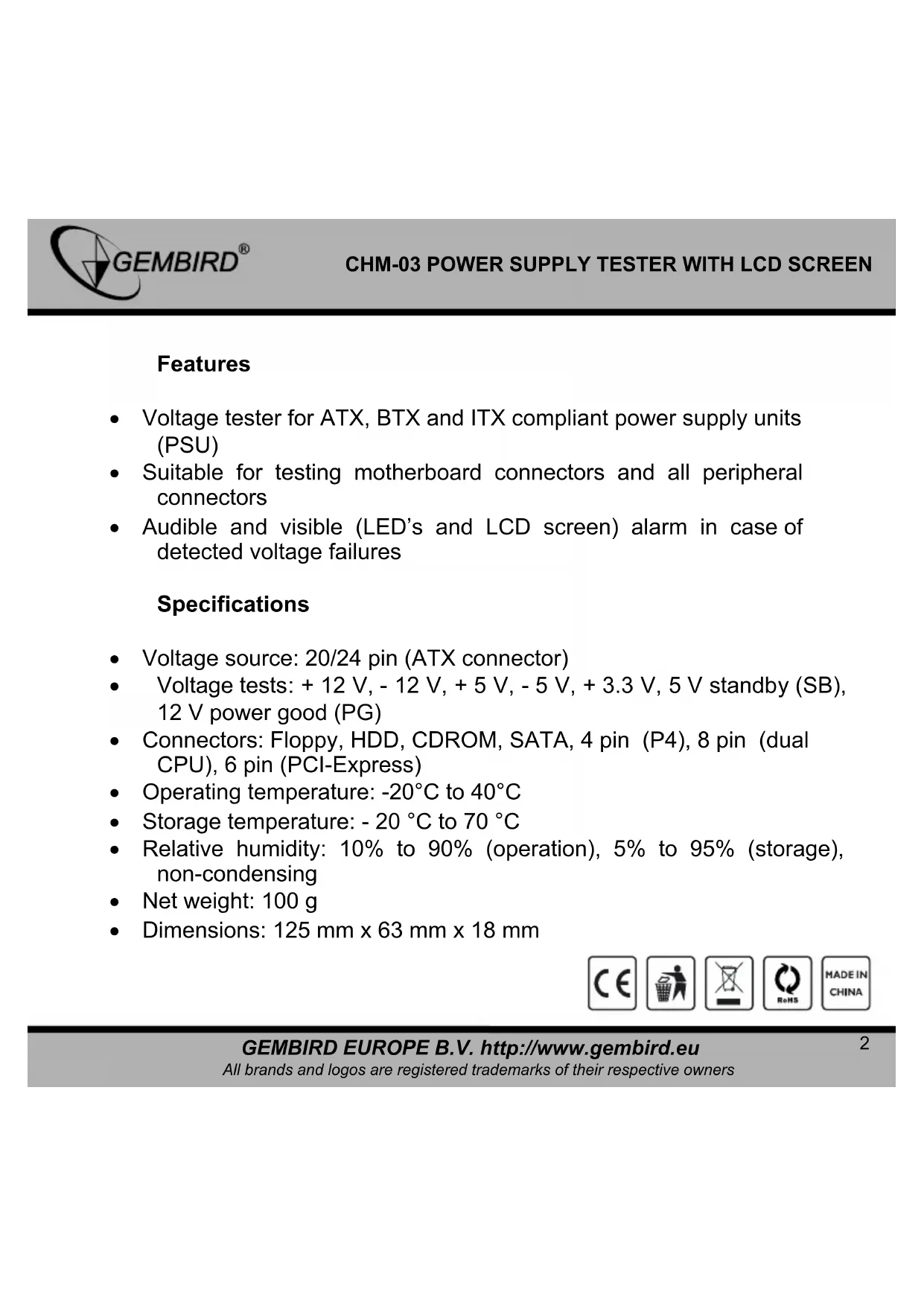 ТЕСТЕР КОМПЬЮТЕРНЫХ БЛОКОВ ПИТАНИЯ ТЕСТЕР НАПРУГ КОМП'ЮТЕРНИХ БЛОКІВ ЖИВЛЕННЯ CHM-032 GEMBIRD EUROPE B.V. http://www.gembird.eu All brands and logos are registered trademarks of their respective owners CHM-03 POWER SUPPLY TESTER WITH LCD SCREEN Features Voltage tester for ATX, BTX and ITX compliant power supply units (PSU) Suitable for testing motherboard connectors and all peripheral connectors Audible and visible (LED’s and LCD screen) alarm in case of detected voltage failures Specifications Voltage source: 20/24 pin (ATX connector) Voltage tests: + 12 V, - 12 V, + 5 V, - 5 V, + 3.3 V, 5 V standby (SB), 12 V power good (PG) Connectors: Floppy, HDD, CDROM, SATA, 4 pin (P4), 8 pin (dual CPU), 6 pin (PCI-Express) Operating temperature: -20°C to 40°C Storage temperature: - 20 °C to 70 °C Relative humidity: 10% to 90% (operation), 5% to 95% (storage), non-condensing Net weight: 100 g Dimensions: 125 mm x 63 mm x 18 mm3 GEMBIRD EUROPE B.V. http://www.gembird.eu All brands and logos are registered trademarks of their respective owners CHM-03 POWER SUPPLY TESTER WITH LCD SCREEN4 GEMBIRD EUROPE B.V. http://www.gembird.eu All brands and logos are registered trademarks of their respective owners CHM-03 POWER SUPPLY TESTER WITH LCD SCREEN5 GEMBIRD EUROPE B.V. http://www.gembird.eu All brands and logos are registered trademarks of their respective owners CHM-03 POWER SUPPLY TESTER WITH LCD SCREEN6 GEMBIRD EUROPE B.V. http://www.gembird.eu All brands and logos are registered trademarks of their respective owners CHM-03 POWER SUPPLY TESTER WITH LCD SCREEN7 GEMBIRD EUROPE B.V. http://www.gembird.eu All brands and logos are registered trademarks of their respective owners CHM-03 POWER SUPPLY TESTER WITH LCD SCREEN Test voltage Normal output range +12V