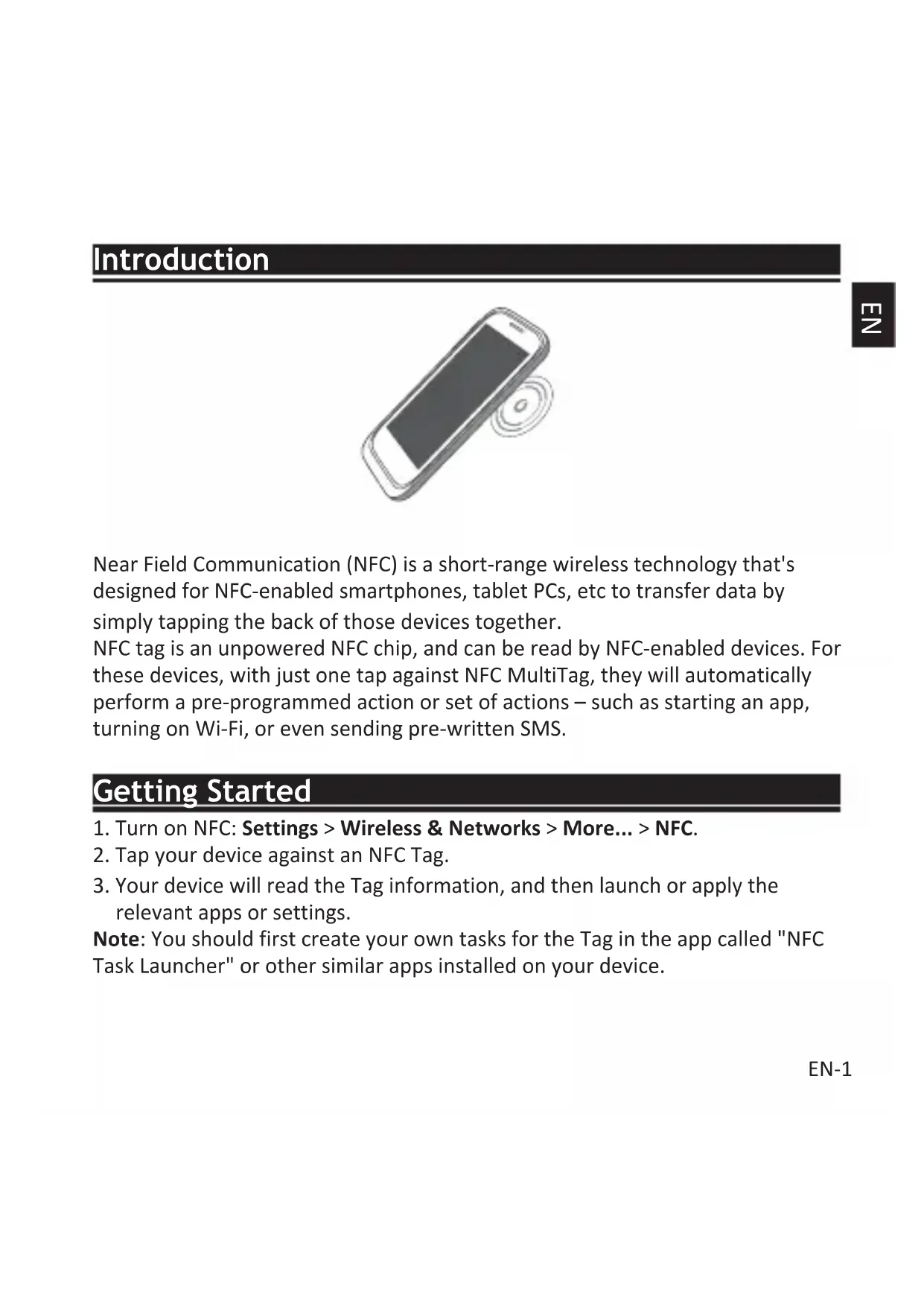EN-1 Introduction Near Field Communication (NFC) is a short-range wireless technology that's designed for NFC-enabled smartphones, tablet PCs, etc to transfer data by simply tapping the back of those devices together. NFC tag is an unpowered NFC chip, and can be read by NFC-enabled devices. For these devices, with just one tap against NFC MultiTag, they will automatically perform a pre-programmed action or set of actions – such as starting an app, turning on Wi-Fi, or even sending pre-written SMS. Getting Started