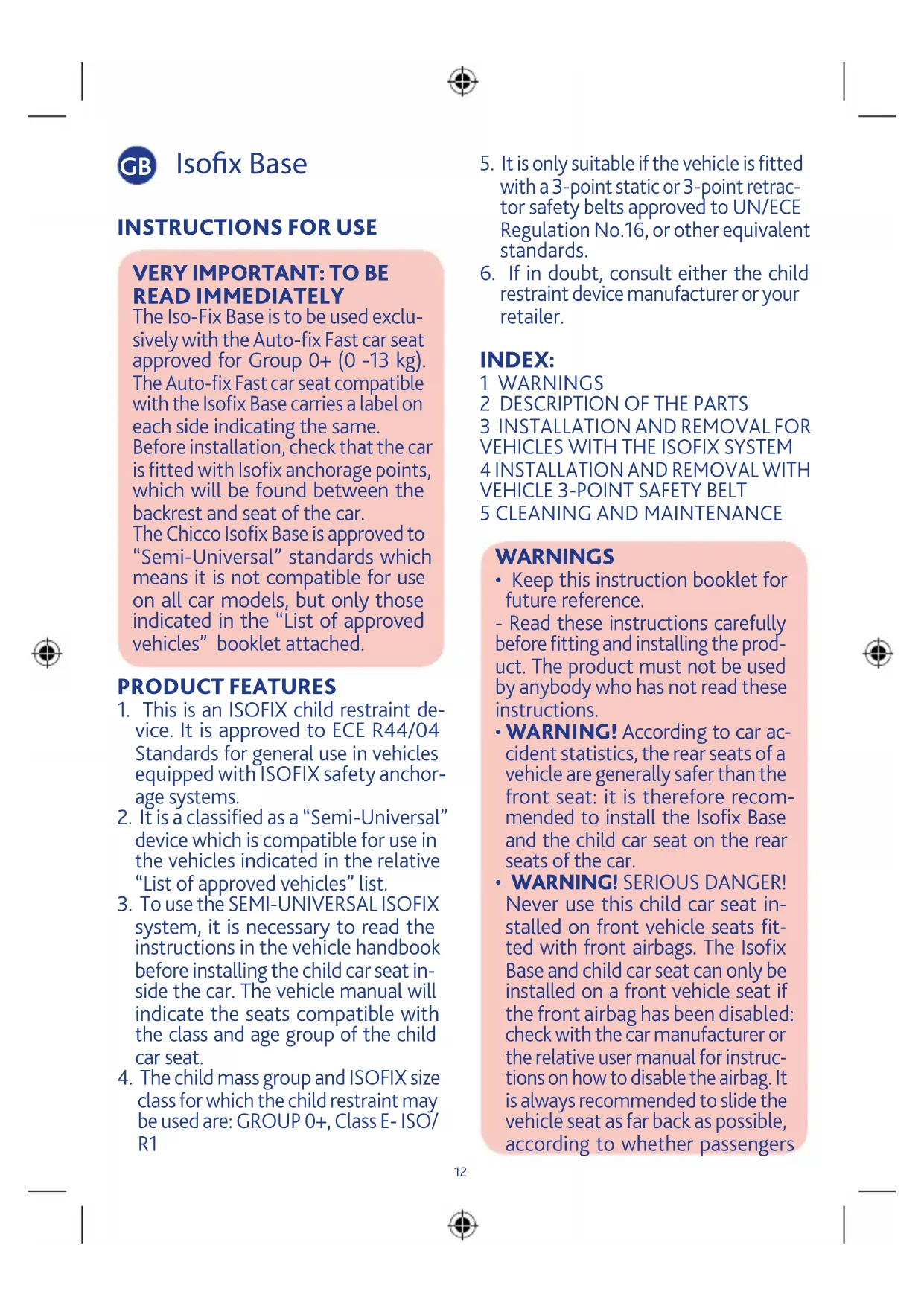 - WARNING! SERIOUS DANGER! Never use this child car seat in- stalled on front vehicle seats fit- ted with front airbags. The Isofix Base and child car seat can only be installed on a front vehicle seat if the front airbag has been disabled: check with the car manufacturer or the relative user manual for instruc- tions on how to disable the airbag. It is always recommended to slide the vehicle seat as far back as possible, according to whether passengers12