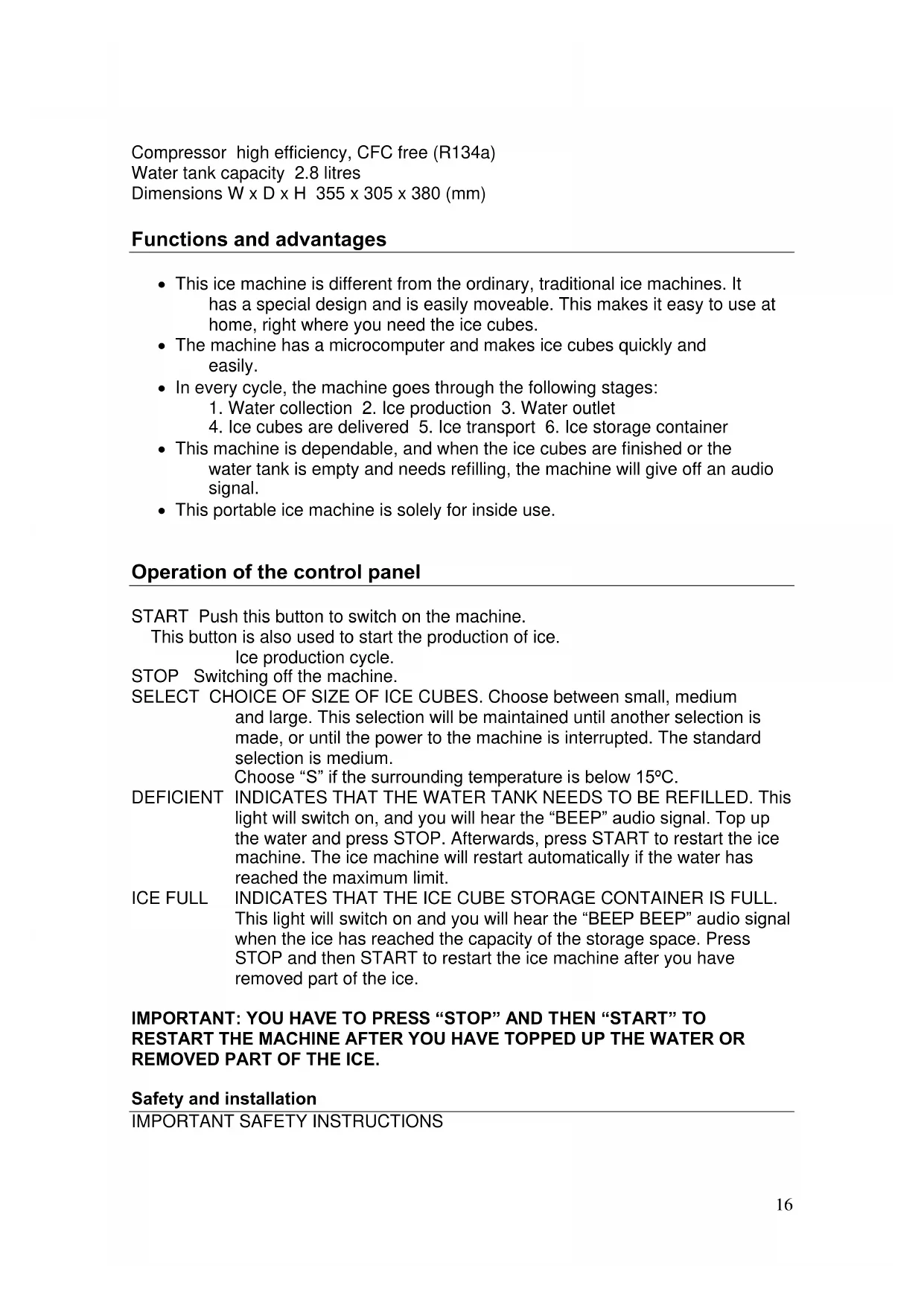 Operation of the control panel START Push this button to switch on the machine. This button is also used to start the production of ice. Ice production cycle. STOP Switching off the machine. SELECT CHOICE OF SIZE OF ICE CUBES. Choose between small, medium and large. This selection will be maintained until another selection is made, or until the power to the machine is interrupted. The standard selection is medium. Choose “S” if the surrounding temperature is below 15ºC. DEFICIENT INDICATES THAT THE WATER TANK NEEDS TO BE REFILLED. This light will switch on, and you will hear the “BEEP” audio signal. Top up the water and press STOP. Afterwards, press START to restart the ice machine. The ice machine will restart automatically if the water has reached the maximum limit. ICE FULL INDICATES THAT THE ICE CUBE STORAGE CONTAINER IS FULL. This light will switch on and you will hear the “BEEP BEEP” audio signal when the ice has reached the capacity of the storage space. Press STOP and then START to restart the ice machine after you have removed part of the ice. IMPORTANT: YOU HAVE TO PRESS “STOP” AND THEN “START” TO RESTART THE MACHINE AFTER YOU HAVE TOPPED UP THE WATER OR REMOVED PART OF THE ICE. Safety and installation