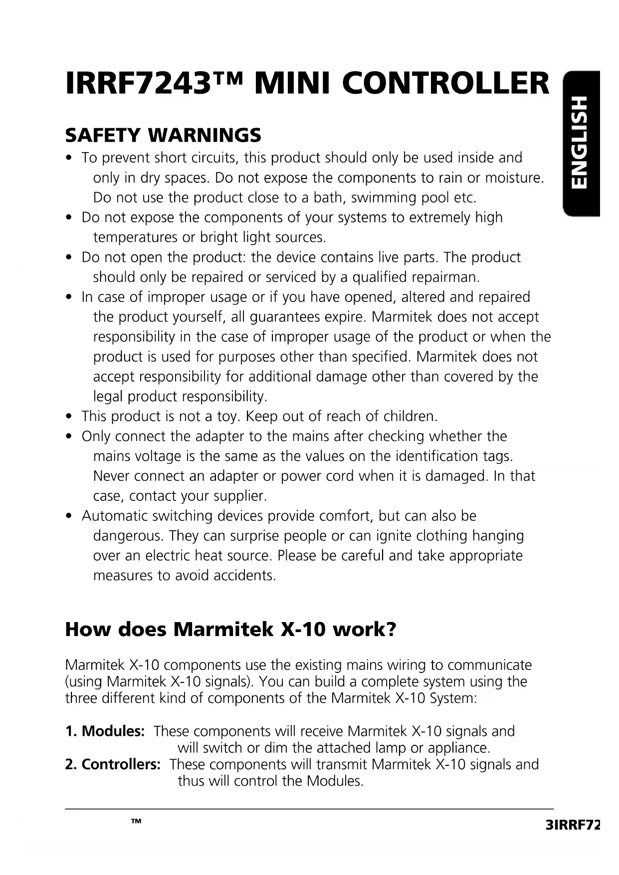ENGLISHMy modules will not respond to my controller. Make sure that the HouseCode on all Modules and Controllers are set to the same HouseCode (A .. P). My modules will not react to my remote / sensor. When you use a remote or sensor, you should have at least one TM13 Transceiver or Marmitek Security Console installed in your house. These components will translate the radio signals to the Marmitek X-10 signal on the power line. Only one Transceiver should be installed for all remotes and sensors set to the same House Code. Am I able to increase the range of my remotes by using more Transceivers? Yes, you can use more than one TM13 Transceiver in your home when the range of your remotes is not sufficient. The TM13 is using so called collision detection to prevent signals to be disturbed when more than one TM13 is transmitting. TM13’s will wait for a quite power line before transmitting their data. To prevent your Marmitek X-10 System to become slow or to prevent dimming from becoming less smooth, make sure that the TM13 units are placed as far away from each other as possible. The IRRF7243 does not work with my remote control. The house code of both the remote control and the rest of the components must have the same letter code. Take care that your Marmitek remote control is installed for use with the IRRF7243. The correct code is to find in the code book of your remote control. My IRRF7243 commands the wrong units. Is the switch ( 1-4 5-8 ) in the wrong position? Which remote controls can I use with the IRRF7243 ? The following remote controls can be used with the IRRF7243: Infrared remotes: