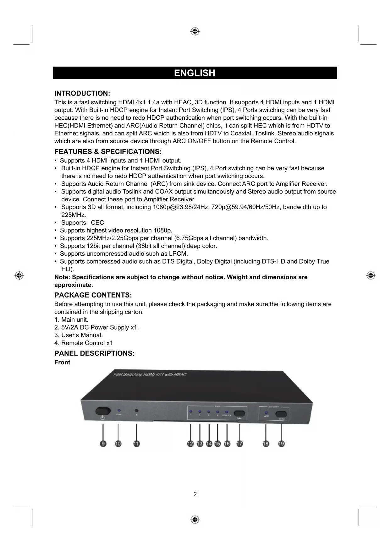 PANEL DESCRIPTIONS: Front3 Back 1 Ethernet: Connect this port to PC. When HDTV with HEC enable HEC function, PC will be connected to Ethernet. 2 Audio Port: Connect the three ports to Amplifier Receiver When select ARC ON, audio output is from HDTV with ARC. When select ARC OFF, audio output is from Source devices. 3 HDMI Output: Connect this port to HDTV 4-7 HDMI Input: Connect these ports to source devices 8 DC/5V: Connect this port to Power Supply 9 Power Switch: Turn on or off the power 10 Power LED: When the switching is working, LED turns blue; When it is standby, LED turns red 11 IR: Receive the signal from Infrared Remote Control 12-15 Input LED: LED will turn on when input port is selected