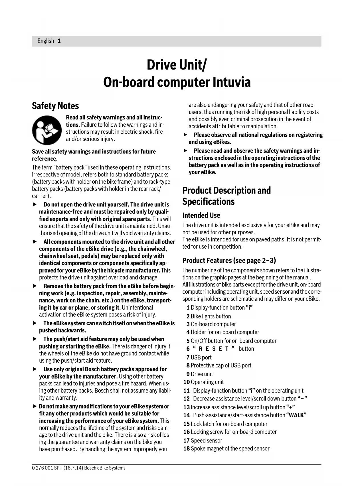 Software version error Contact your Bosch eBike dealer so that he can perform a software update. No display Internal error of the on-board computer Restart your eBike system by switching it off and back on. Code Cause Corrective MeasureEnglish–8 Bosch eBike Systems 0 276 001 SPI | (16.7.14) Maintenance and Service Maintenance and Cleaning Keep all components of your eBike clean, especially the bat- tery-pack contacts and corresponding holder contacts. Clean them carefully with a soft, damp cloth. All components including the drive unit may not be immersed in water or cleaned with a high-pressure cleaner. For service or repairs on the eBike, please refer to an author- ised bicycle dealer. After-sales Service and Application Service In case of questions concerning the eBike system and its com- ponents, please refer to an authorised Bosch eBike dealer. For contact data of authorised Bosch eBike dealers, please refer to www.bosch-ebike.com Transport The battery packs are subject to the Dangerous Goods Legis- lation requirements. Private users can transport undamaged battery packs by road without further requirements. When being transported by commercial users or third parties (e.g. air transport or forwarding agency), special require- ments on packaging and labelling must be observed (e.g. ADR regulations). If necessary, an expert for hazardous materials can be consulted when preparing the item for shipping. Dispatch battery packs only when the housing is undamaged. Tape or mask off open contacts and pack up the battery pack in such a manner that it cannot move around in the packaging. Inform your parcel service that the package contains danger- ous goods. Please also observe the possiblity of more de- tailed national regulations. In case of questions concerning transport of the battery packs, please refer to an authorised Bosch eBike dealer. The Bosch eBike dealers can also provide suitable transport pack- aging. Disposal The drive unit, on-board computer including operat- ing unit, battery pack, speed sensor, accessories and packaging should be disposed of in an environmental- ly correct manner. Do not dispose of eBikes and their components into house- hold waste! Only for EC countries: According to the European Guideline 2012/19/EU, electrical devices/tools that are no longer usable, and according to the European Guideline 2006/66/EC, defec- tive or used battery packs/batteries, must be collected separately and disposed of in an environmentally correct manner. The integrated battery pack in the on-board computer may only be removed for disposal. Opening the housing shell can destroy the on-board computer. Please return battery packs and on-board computers that are no longer usable to an authorised bicycle dealer. Li-ion: Please observe the instructions in sec- tion “Transport”, page English–8. Subject to change without notice.English–9 0 276 001 SPI | (16.7.14) Bosch eBike Systems Lithium ion battery pack PowerPack Safety Notes Read all safety warnings and all instructions. Failure to follow the warnings and in- structions may result in elec- tric shock, fire and/or serious injury. Save all safety warnings and instructions for future reference. The term “battery pack” used in these operating instructions refers both to standard battery packs (battery packs with holder on the bike frame) and to rack-type battery packs (battery packs with holder in the rear rack/carrier), except when explicitly referring to the design type. Remove the battery pack from the eBike before begin- ning work (e.g. inspection, repair, assembly, mainte- nance, work on the chain, etc.) on the eBike, transport- ing it by car or plane, or storing it. Unintentional activation of the eBike system poses a risk of injury. Do not open the battery pack. Danger of short-circuiting. Opening the battery pack voids any and all warranty claims. Protect the battery pack against heat (e.g., also against continuous intense sunlight), fire and immersing into water. Danger of explosion. Keep the battery pack not being used away from paper clips, coins, keys, nails, screws or other small metal objects, that can make a connection from one terminal to another. Shorting the battery-pack terminals together may cause burns or a fire. For short-circuiting damage caused in this manner, any and all warranty claims through Bosch shall be invalid. Under abusive conditions, liquid may be ejected from the battery pack. Avoid contact. If contact accidentally occurs, flush with water. If liquid contacts eyes, addi- tionally seek medical help. Liquid ejected from the bat- tery pack may cause skin irritations or burns. Battery packs must not be subjected to mechanical im- pacts. There is a risk that the battery pack will be damaged causing vapors to escape. The vapors can irritate the res- piratory system. Provide for fresh air and seek medical at- tention in case of complaints. Vapours can escape in case of damage and improper use of the battery pack. Provide for fresh air and seek medical attention in case of complaints. The vapours can irritate the respiratory system. Charge the battery pack only with original Bosch bat- tery chargers. When using non-original Bosch chargers, the danger of fire cannot be excluded. Use the battery pack only together with eBikes that have an original Bosch eBike drive system. This is the only way to protect the battery pack against dangerous overload. Use only original Bosch battery packs approved for your eBike by the manufacturer. Using other battery packs can lead to injuries and pose a fire hazard. When us- ing other battery packs, Bosch shall not assume any liabil- ity and warranty. Read the safety warnings and instructions in the oper- ating instructions of the charger and the drive unit / on- board computer as well as in the operating instructions of your eBike. Keep the battery pack out of reach of children. Product Description and Specifications Product Features (see page 4–5) The numbering o