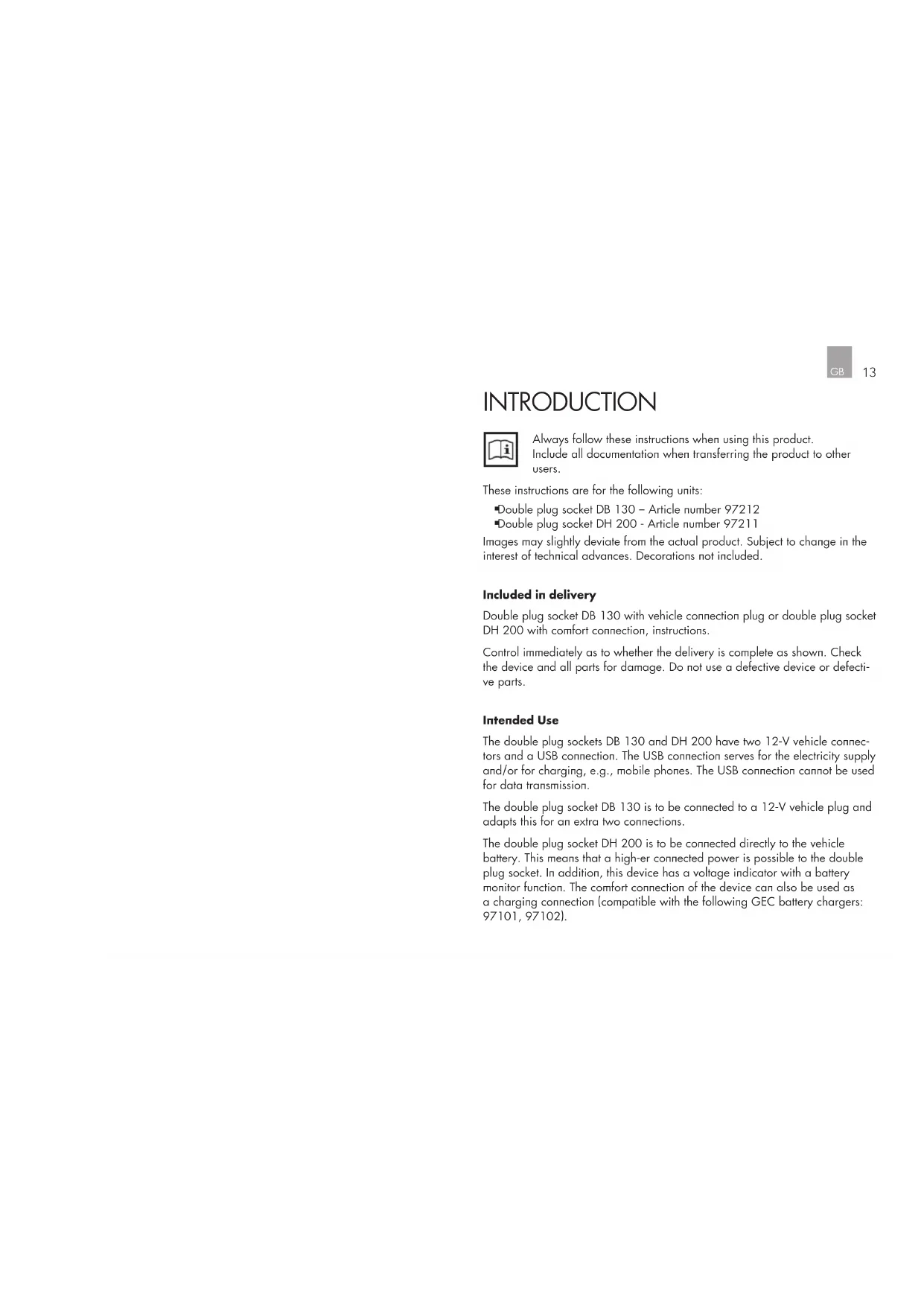 Double plug socket DH 200 - Article number 97211 Images may slightly deviate from the actual product. Subject to change in the interest of technical advances. Decorations not included. Included in delivery Double plug socket DB 130 with vehicle connection plug or double plug socket DH 200 with comfort connection, instructions. Control immediately as to whether the delivery is complete as shown. Check the device and all parts for damage. Do not use a defective device or defecti- ve parts. Intended Use The double plug sockets DB 130 and DH 200 have two 12-V vehicle connec- tors and a USB connection. The USB connection serves for the electricity supply and/or for charging, e.g., mobile phones. The USB connection cannot be used for data transmission. The double plug socket DB 130 is to be connected to a 12-V vehicle plug and adapts this for an extra two connections. The double plug socket DH 200 is to be connected directly to the vehicle battery. This means that a high-er connected power is possible to the double plug socket. In addition, this device has a voltage indicator with a battery monitor function. The comfort connection of the device can also be used as a charging connection (compatible with the following GEC battery chargers: 97101, 97102).1514