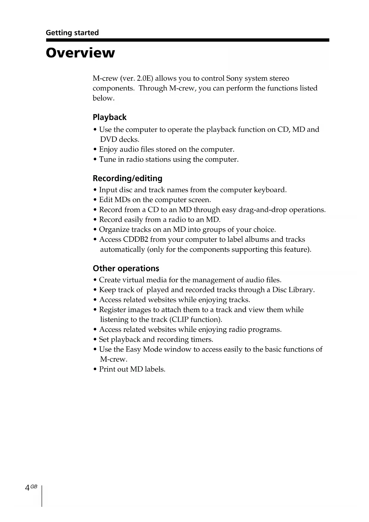 Getting started Overview M-crew (ver. 2.0E) allows you to control Sony system stereo components. Through M-crew, you can perform the functions listed below. Playback