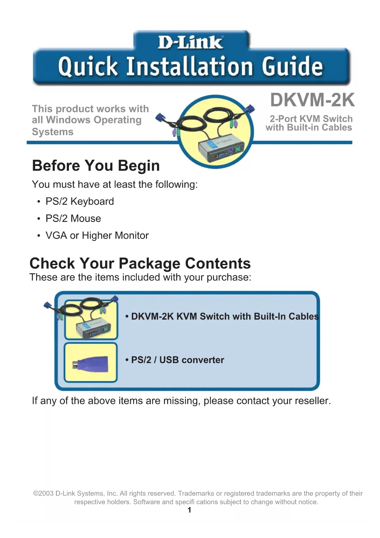 2-Port KVM Switch with Built-in Cables DKVM-2K This product works with all Windows Operating Systems Check Your Package Contents These are the items included with your purchase: Before You Begin You must have at least the following: