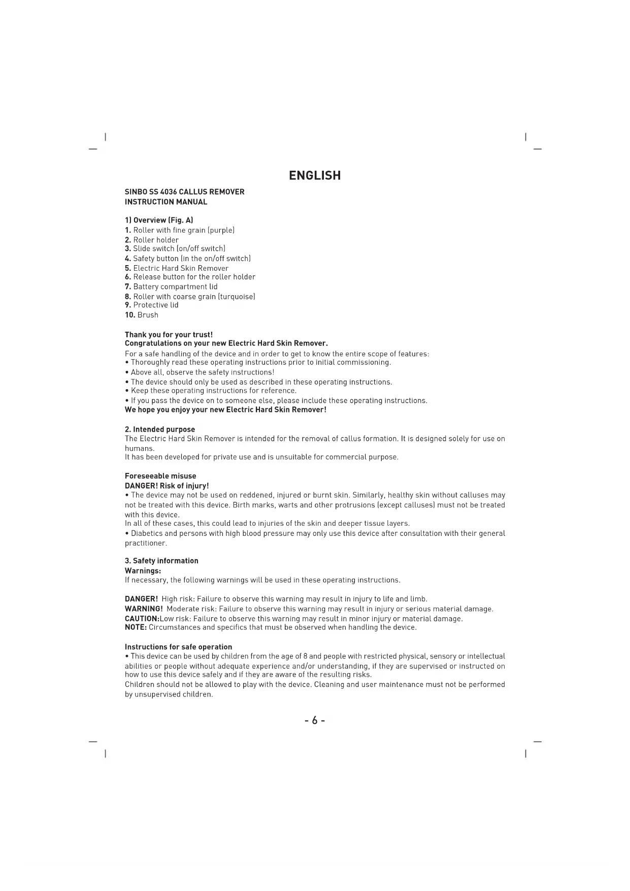 The Electric Hard Skin Remover is intended for the removal of callus formation. It is designed solely for use on humans. It has been developed for private use and is unsuitable for commercial purpose. Foreseeable misuse DANGER! Risk of injury!