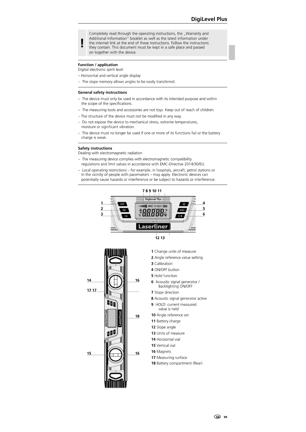 Function / application Digital electronic spirit level – Horizontal and vertical angle display – The slope memory allows angles to be easily transferred. General safety instructions – The device must only be used in accordance with its intended purpose and within the scope of the specications. – The measuring tools and accessories are not toys. Keep out of reach of children. – The structure of the device must not be modied in any way. – Do not expose the device to mechanical stress, extreme temperatures, moisture or signicant vibration. – The device must no longer be used if one or more of its functions fail or the battery charge is weak. Safety instructions Dealing with electromagnetic radiation – The measuring device complies with electromagnetic compatibility regulations and limit values in accordance with EMC-Directive 2014/30/EU. – Local operating restrictions – for example, in hospitals, aircraft, petrol stations or in the vicinity of people with pacemakers – may apply. Electronic devices can potentially cause hazards or interference or be subject to hazards or interference. DigiLevel Plus