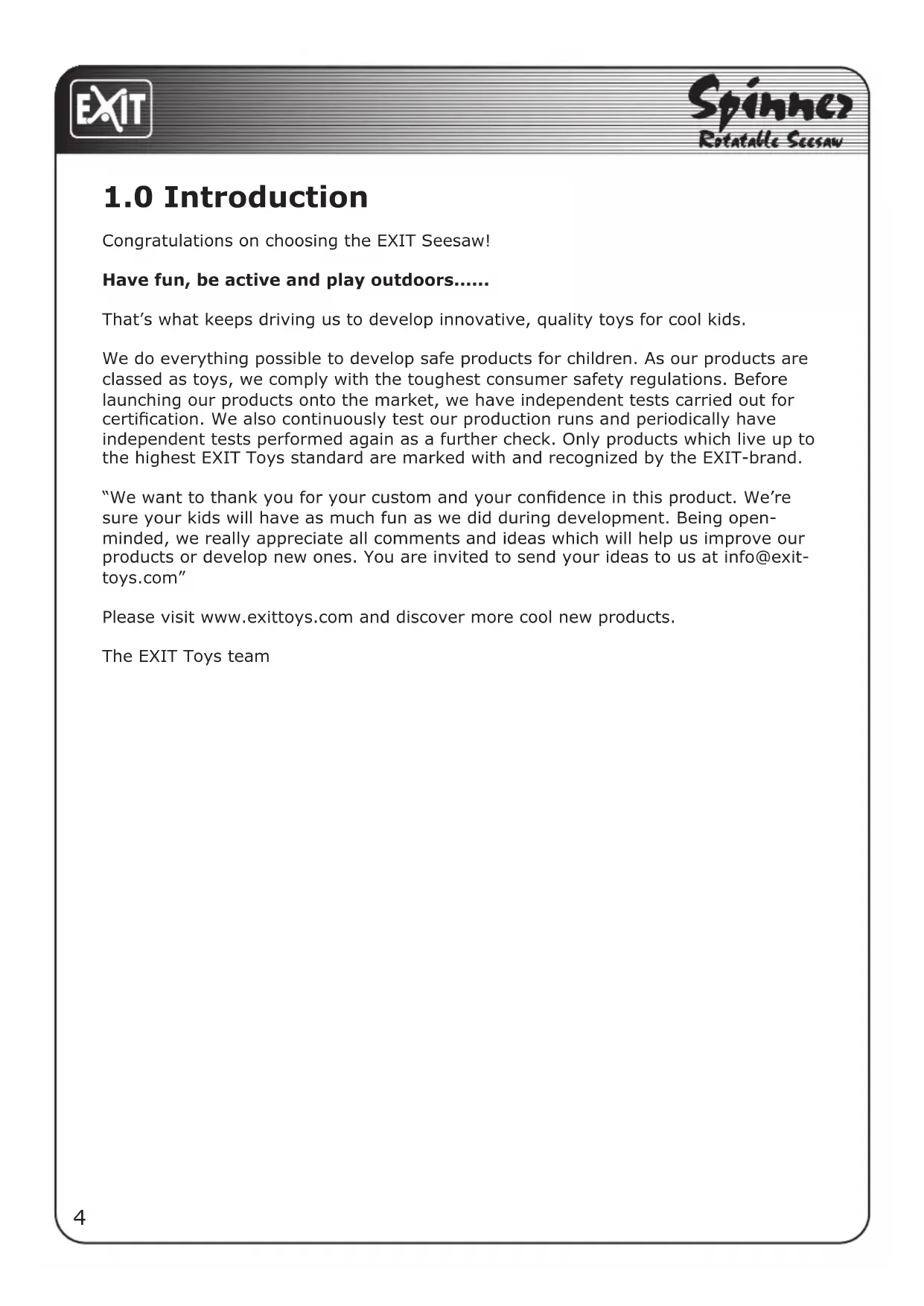 "We want to thank you for your custom and your confidence in this product. We're sure your kids will have as much fun as we did during development. Being open-minded, we really appreciate all comments and ideas which will help us improve our products or develop new ones. You are invited to send your ideas to us at info@exittoys.com"
