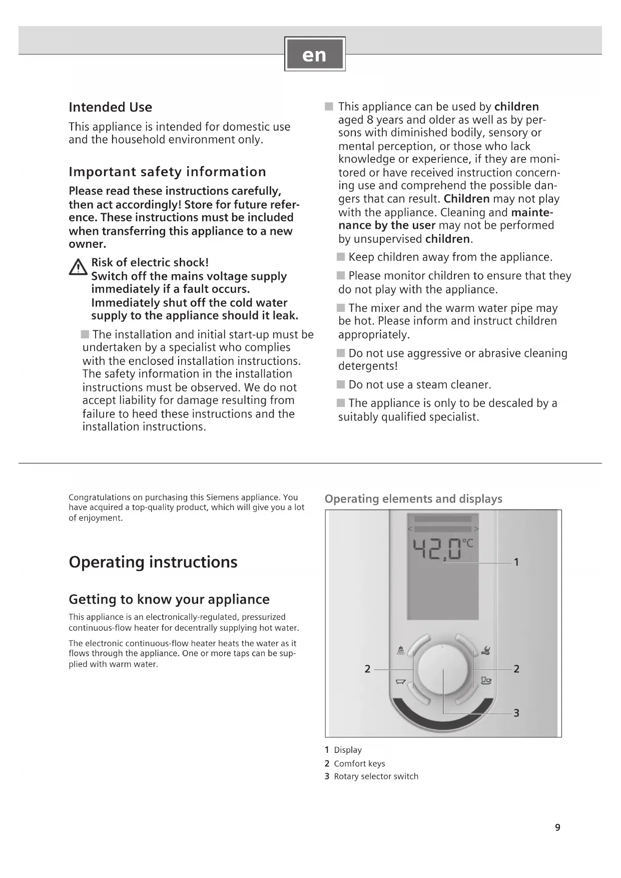 Intended Use This appliance is intended for domestic use and the household environment only. Important safety information Please read these instructions carefully, then act accordingly! Store for future refer- ence. These instructions must be included when transferring this appliance to a new owner. Risk of electric shock! Switch off the mains voltage supply immediately if a fault occurs. Immediately shut off the cold water supply to the appliance should it leak. ■ The installation and initial start-up must be undertaken by a specialist who complies with the enclosed installation instructions. The safety information in the installation instructions must be observed. We do not accept liability for damage resulting from failure to heed these instructions and the installation instructions. ■ This appliance can be used by children aged 8 years and older as well as by per- sons with diminished bodily, sensory or mental perception, or those who lack knowledge or experience, if they are moni- tored or have received instruction concern- ing use and comprehend the possible dan- gers that can result. Children may not play with the appliance. Cleaning and mainte- nance by the user may not be performed by unsupervised children. ■ Keep children away from the appliance. ■ Please monitor children to ensure that they do not play with the appliance. ■ The mixer and the warm water pipe may be hot. Please inform and instruct children appropriately. ■ Do not use aggressive or abrasive cleaning detergents! ■ Do not use a steam cleaner. ■ The appliance is only to be descaled by a suitably qualified specialist. Congratulations on purchasing this Siemens appliance. You have acquired a top-quality product, which will give you a lot of enjoyment. Operating instructions Getting to know your appliance This appliance is an electronically-regulated, pressurized continuous-flow heater for decentrally supplying hot water.The electronic continuous-flow heater heats the water as it flows through the appliance. One or more taps can be sup-plied with warm water. Operating elements and displays