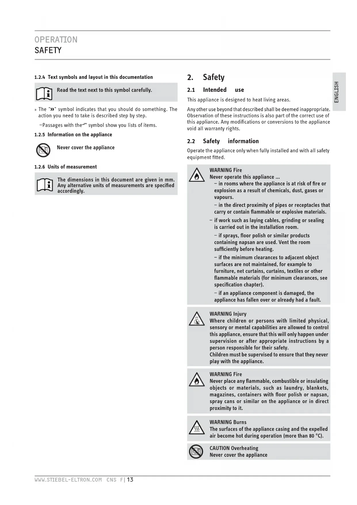 Operate the appliance only when fully installed and with all safety equipment fitted. WARNING Fire Never operate this appliance ... — in rooms where the appliance is at risk of fire or explosion as a result of chemicals, dust, gases or vapours. — in the direct proximity of pipes or receptacles that carry or contain flammable or explosive materials. — if work such as laying cables, grinding or sealing is carried out in the installation room. — if sprays, floor polish or similar products containing napsan are used. Vent the room sufficiently before heating. — if the minimum clearances to adjacent object surfaces are not maintained, for example to furniture, net curtains, curtains, textiles or other flammable materials (for minimum clearances, see specification chapter). — if an appliance component is damaged, the appliance has fallen over or already had a fault. WARNING Injury Where children or persons with limited physical, sensory or mental capabilities are allowed to control this appliance, ensure that this will only happen under supervision or after appropriate instructions by a person responsible for their safety. Children must be supervised to ensure that they never play with the appliance. WARNING Fire Never place any flammable, combustible or insulating objects or materials, such as laundry, blankets, magazines, containers with floor polish or napsan, spray cans or similar on the appliance or in direct proximity to it. WARNING Burns The surfaces of the appliance casing and the expelled air become hot during operation (more than 80 °C). CAUTION Overheating Never cover the applianceHTV`.HC