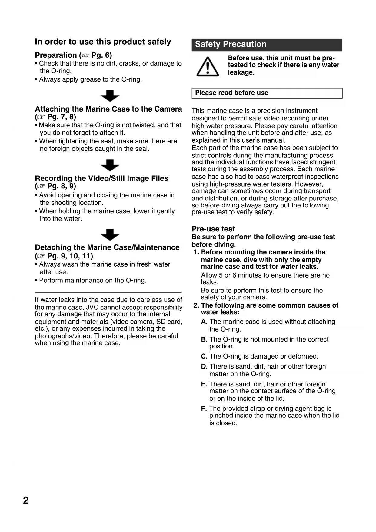 on the marine case every time you use it. The marine case must withstand water pressure with use. Repeated exposure to pressure eventually leads to material fatigue, which may result in damage of the marine case. Every time you use the marine case, check in advance that there are no scratches or cracks. If you frequently use the marine case, be sure to ask for maintenance at the store of purchase. (There is a charge for maintenance.) To protect your camera and ensure optimum use, keep the examples listed above in mind when using the marine case. JVC accepts no responsibility for water leakage or damage to anything inside the marine case (camera, SD card, etc.) due to careless usage of this product. Be sure to follow correct procedures when using the marine case.
