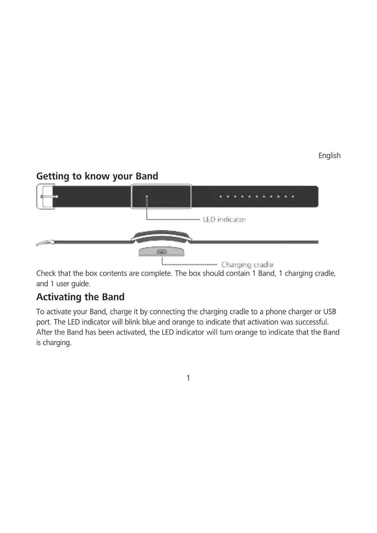 Getting to know your Band Check that the box contents are complete. The box should contain 1 Band, 1 charging cradle, and 1 user guide. Activating the Band To activate your Band, charge it by connecting the charging cradle to a phone charger or USB port. The LED indicator will blink blue and orange to indicate that activation was successful. After the Band has been activated, the LED indicator will turn orange to indicate that the Band is charging.English