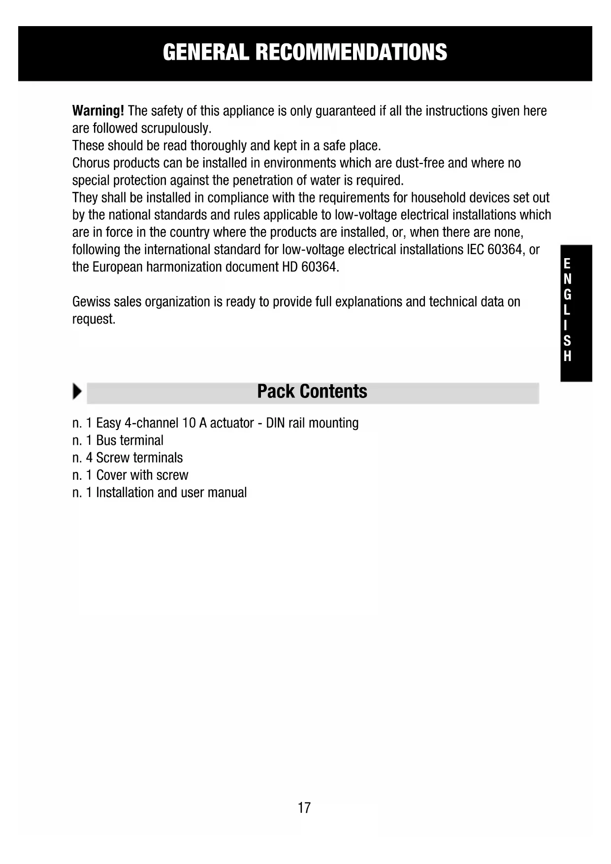 GENERAL RECOMMENDATIONS Warning! The safety of this appliance is only guaranteed if all the instructions given here are followed scrupulously. These should be read thoroughly and kept in a safe place. Chorus products can be installed in environments which are dust-free and where no special protection against the penetration of water is required. They shall be installed in compliance with the requirements for household devices set out by the national standards and rules applicable to low-voltage electrical installations which are in force in the country where the products are installed, or, when there are none, following the international standard for low-voltage electrical installations IEC 60364, or the European harmonization document HD 60364. Gewiss sales organization is ready to provide full explanations and technical data on request. n. 1 Easy 4-channel 10 A actuator - DIN rail mounting n. 1 Bus terminal n. 4 Screw terminals n. 1 Cover with screw n. 1 Installation and user manual Pack Contents18 GENERAL DESCRIPTION The Easy 4-channel 10 A actuator – DIN rail mounting allows up to 4 different electrical loads to be activated/deactivated separately by means of 4 x 10 A relays, each one fitted with 1 NO output contact. The switchover command of the relay can arrive from command devices or sensors of the Home Automation system, via the KNX BUS, or be locally generated by the front push-buttons. The actuator is powered from the BUS line and has 4 front green LEDs for signalling the output status. The device sends information to the bus about the relay status (ON = contact closed, OFF = contact open) when switching on, receiving a command and in the case of a command from a local push-button. Each output channel of the actuator can be configured separately and allows the ON/OFF command of the controlled loads, execution of timed commands, scene management and execution of priority commands to force the output status. The operating modes can be used simultaneously. This means, for instance, that the device can switch a light on and off, or automatically switch it on and off after a certain pre-established time, simply on the basis of the command received. The module is assembled on the DIN rail, inside the electric boards or junction boxes. Each channel of the actuator can be configured with the Easy controller to carry out the following functions:
