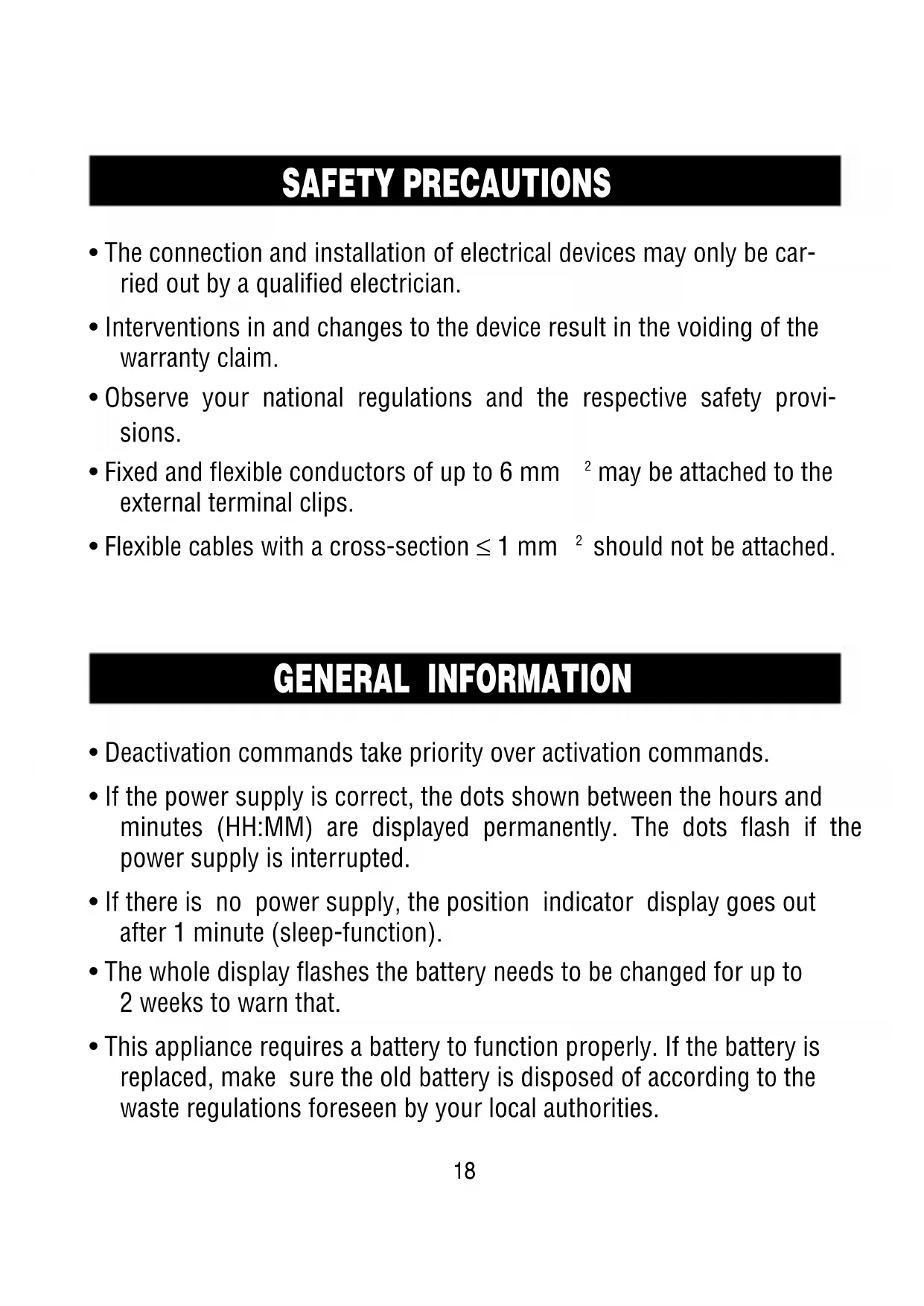 The time switch has a sleep-function when not connected to power supply, that keeps screen blank. This function is activated after 2 minutes of no key board operations. All settings saved will remain in the memory.