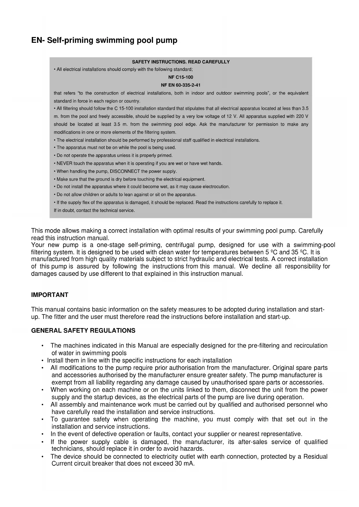 Your new pump is a one-stage self-priming, centrifugal pump, designed for use with a swimming-pool filtering system. It is designed to be used with clean water for temperatures between 5 °C and 35 °C. It is manufactured from high quality materials subject to strict hydraulic and electrical tests. A correct installation of this pump is assured by following the instructions from this manual. We decline all responsibility for damages caused by use different to that explained in this instruction manual.