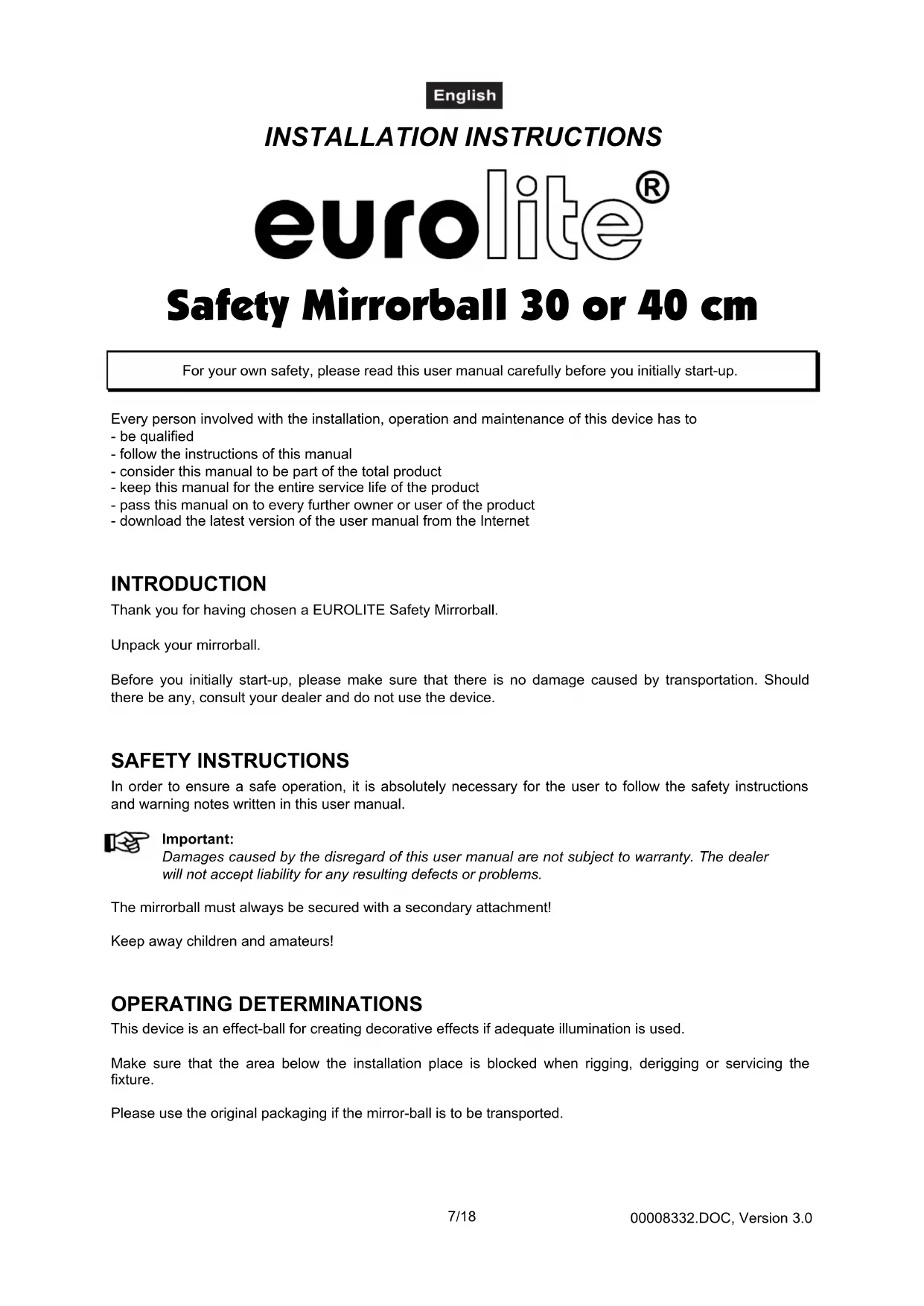7/18 INSTALLATION INSTRUCTIONS Safety Mirrorball 30 or 40 cm For your own safety, please read this user manual carefully before you initially start-up. Every person involved with the installation, operation and maintenance of this device has to - be qualified - follow the instructions of this manual - consider this manual to be part of the total product - keep this manual for the entire service life of the product - pass this manual on to every further owner or user of the product - download the latest version of the user manual from the Internet INTRODUCTION Thank you for having chosen a EUROLITE Safety Mirrorball. Unpack your mirrorball. Before you initially start-up, please make sure that there is no damage caused by transportation. Should there be any, consult your dealer and do not use the device. SAFETY INSTRUCTIONS In order to ensure a safe operation, it is absolutely necessary for the user to follow the safety instructions and warning notes written in this user manual. Important: Damages caused by the disregard of this user manual are not subject to warranty. The dealer will not accept liability for any resulting defects or problems. The mirrorball must always be secured with a secondary attachment! Keep away children and amateurs! OPERATING DETERMINATIONS This device is an effect-ball for creating decorative effects if adequate illumination is used. Make sure that the area below the installation place is blocked when rigging, derigging or servicing the fixture. Please use the original packaging if the mirror-ball is to be transported.00008332.DOC, Version 3.0 8/18 If this mirror-ball will be operated in any way different to the one described in this manual, the product may