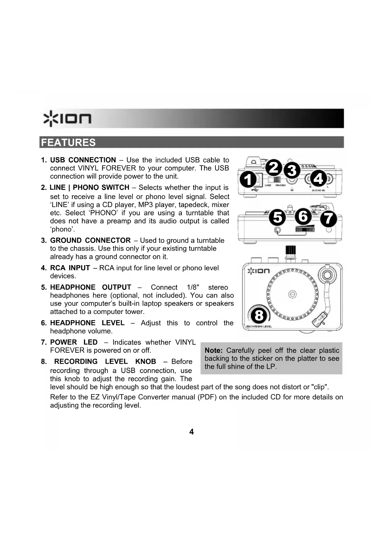 Note: Carefully peel off the clear plastic backing to the sticker on the platter to see the full shine of the LP.5 TROUBLESHOOTING See below for the answers to common questions. Consult the EZ Vinyl/Tape Converter Quickstart Guide (PDF) on the included CD or at www.ionaudio.com/ezvc