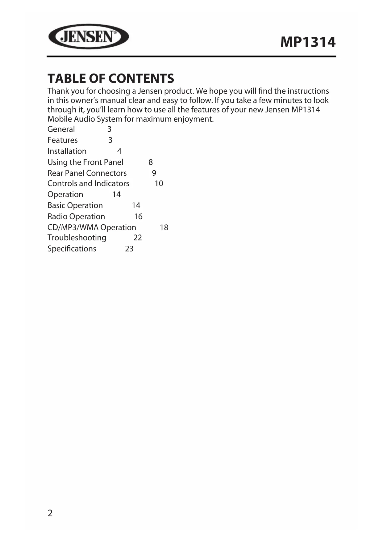 Thank you for choosing a Jensen product. We hope you will nd the instructions in this owner’s manual clear and easy to follow. If you take a few minutes to look through it, you’ll learn how to use all the features of your new Jensen MP1314 Mobile Audio System for maximum enjoyment. General 3 Features 3 Installation 4 Using the Front Panel 8 Rear Panel Connectors 9 Controls and Indicators 10 Operation 14 Basic Operation 14 Radio Operation 16 CD/MP3/WMA Operation 18 Troubleshooting 22 Specications 233 MP1314 WARNING! Never disassemble or adjust the unit. WARNING! To prevent injury from shock or re, never expose this unit to moisture or water. WARNING! Never use irregular discs. GENERAL Congratulations on your purchase of the Jensen MP1314 Mobile Audio System. It’s a good idea to read all of the instructions before beginning the installation. We recommend having your Jensen MP1314 installed by a reputable installation shop. PLL Synthesizer Stereo Radio RBDS Operation CD/MP3/WMA Player Automatic Memory Storing Detachable Front Panel Preset Equalization Electronic Shockproof (ESP) Function Memory Card Interface USB Interface Auxiliary Input Function Features