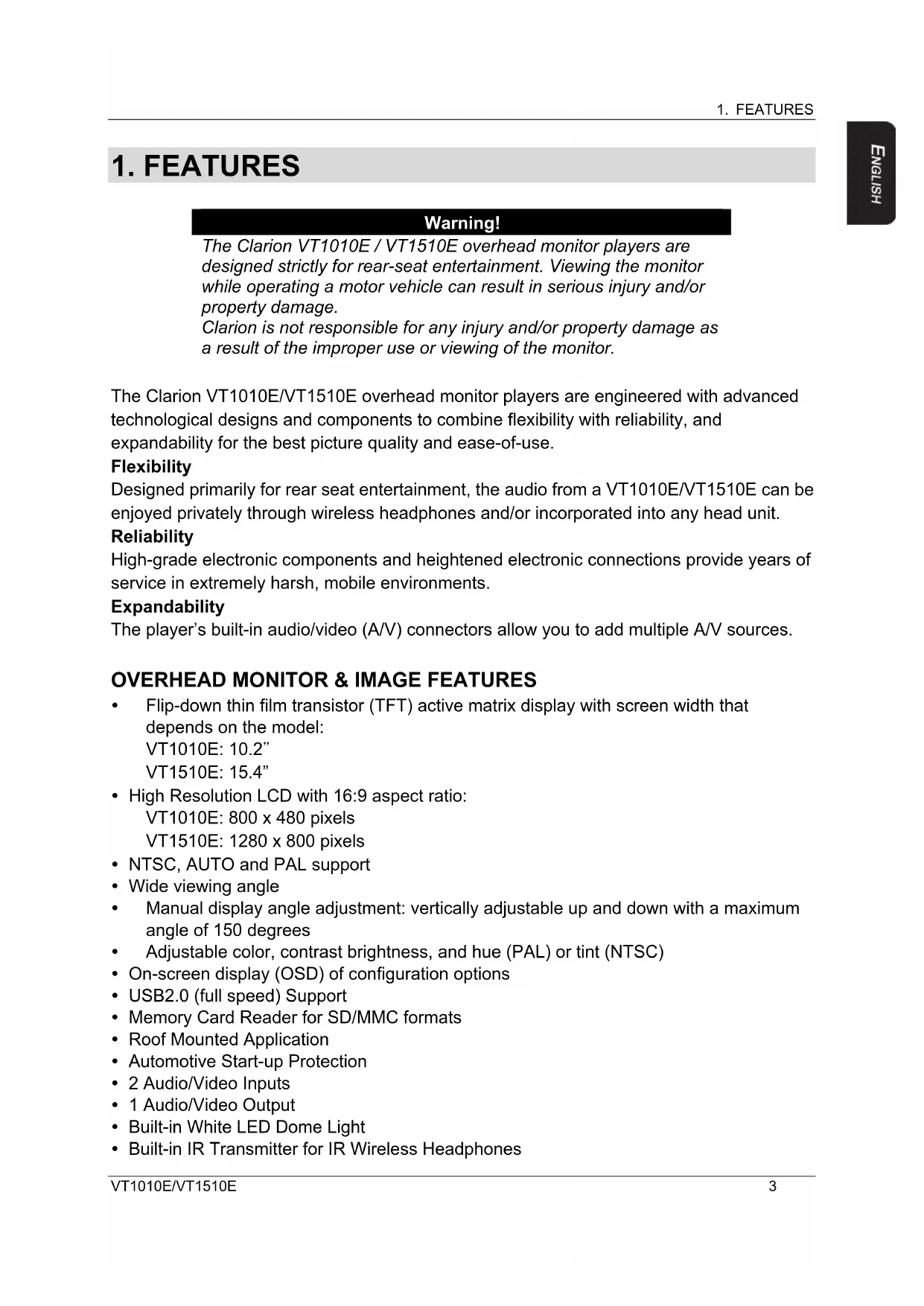Warning! The Clarion VT1010E / VT1510E overhead monitor players are designed strictly for rear-seat entertainment. Viewing the monitor while operating a motor vehicle can result in serious injury and/or property damage. Clarion is not responsible for any injury and/or property damage as a result of the improper use or viewing of the monitor.
