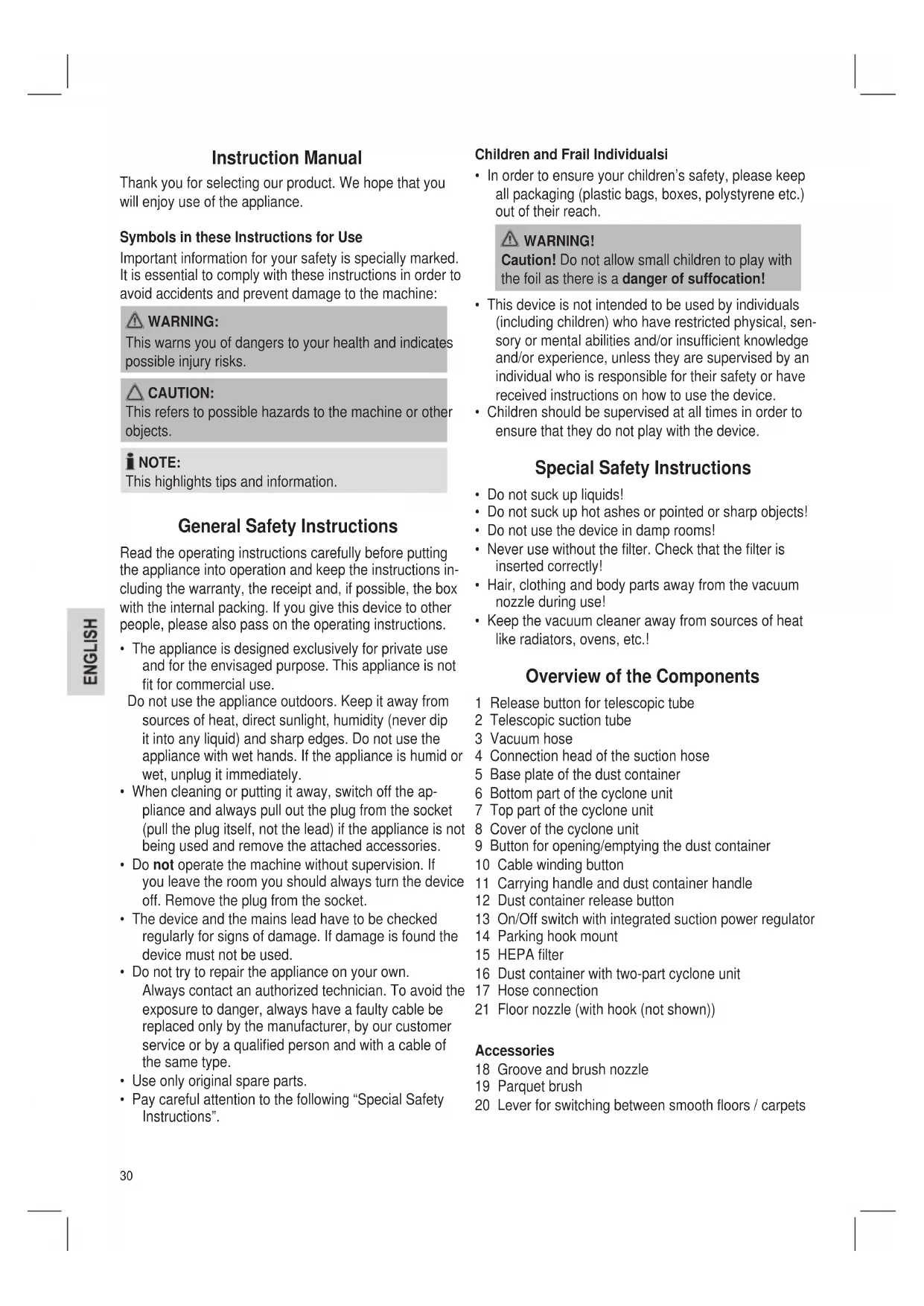 - Keep the vacuum cleaner away from sources of heat like radiators, ovens, etc.! Overview of the Components 1 Release button for telescopic tube 2 Telescopic suction tube 3 Vacuum hose 4 Connection head of the suction hose 5 Base plate of the dust container 6 Bottom part of the cyclone unit 7 Top part of the cyclone unit 8 Cover of the cyclone unit 9 Button for opening/emptying the dust container 10 Cable winding button 11 Carrying handle and dust container handle 12 Dust container release button 13 On/Off switch with integrated suction power regulator 14 Parking hook mount 15 HEPA lter 16 Dust container with two-part cyclone unit 17 Hose connection 21 Floor nozzle (with hook (not shown)) Accessories 18 Groove and brush nozzle 19 Parquet brush 20 Lever for switching between smooth oors / carpets Instruction Manual Thank you for selecting our product. We hope that you will enjoy use of the appliance. Symbols in these Instructions for Use Important information for your safety is specially marked. It is essential to comply with these instructions in order to avoid accidents and prevent damage to the machine:
