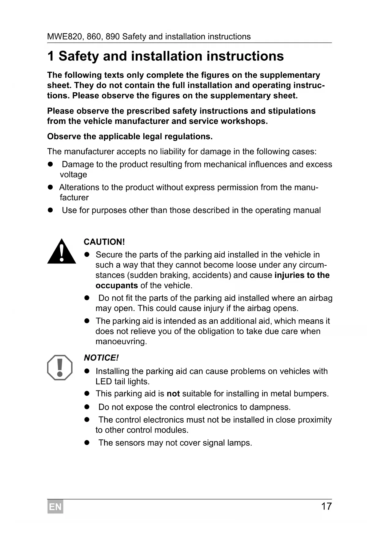 NOTICE! Installing the parking aid can cause problems on vehicles with LED tail lights. This parking aid is not suitable for installing in metal bumpers. Do not expose the control electronics to dampness. The control electronics must not be installed in close proximity to other control modules. The sensors may not cover signal lamps.EN Scope of delivery MWE820, 860, 890
