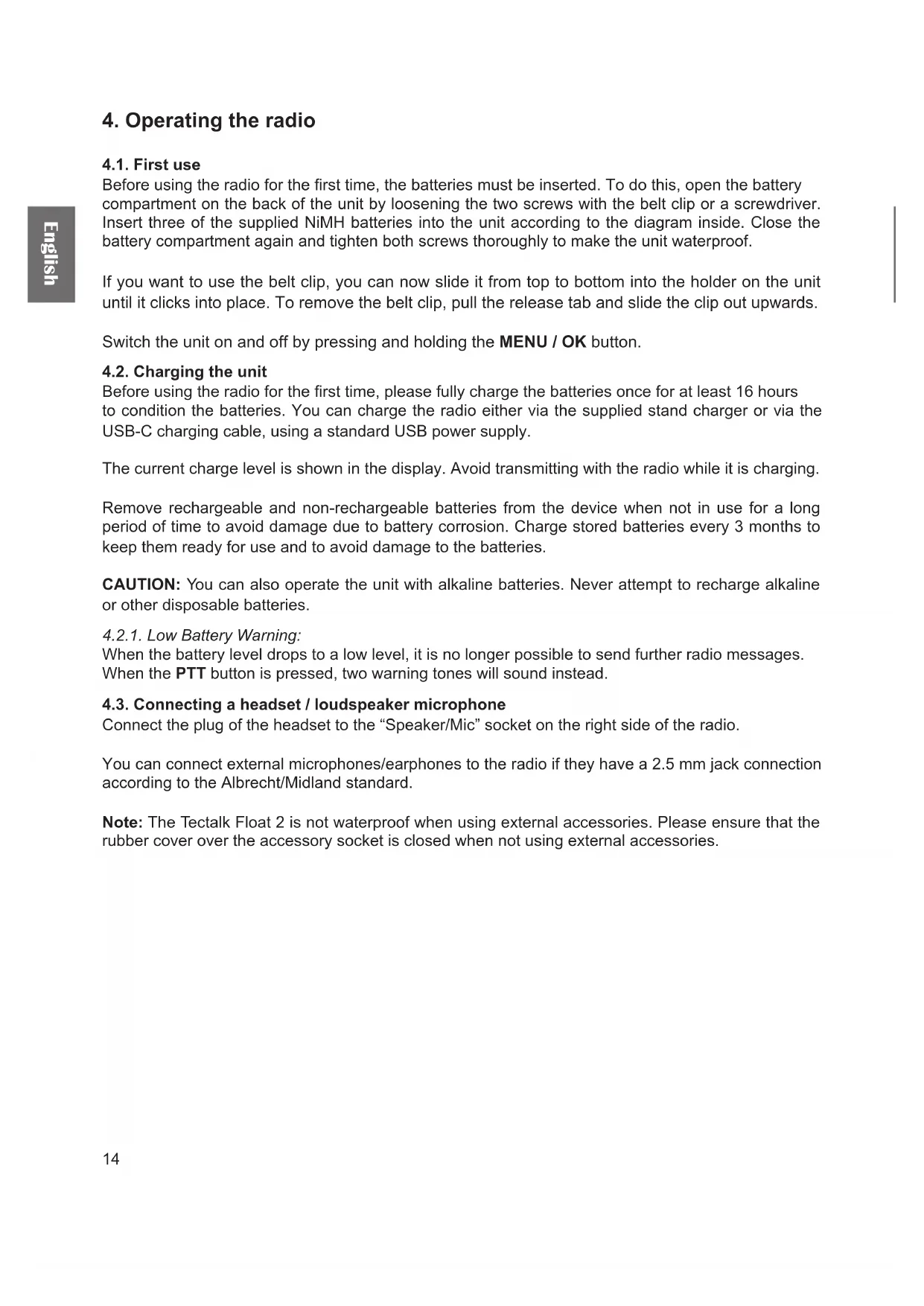 4.1. First use Before using the radio for the rst time, the batteries must be inserted. To do this, open the battery compartment on the back of the unit by loosening the two screws with the belt clip or a screwdriver. Insert three of the supplied NiMH batteries into the unit according to the diagram inside. Close the battery compartment again and tighten both screws thoroughly to make the unit waterproof. If you want to use the belt clip, you can now slide it from top to bottom into the holder on the unit until it clicks into place. To remove the belt clip, pull the release tab and slide the clip out upwards. Switch the unit on and off by pressing and holding the MENU / OK button. 4.2. Charging the unit Before using the radio for the rst time, please fully charge the batteries once for at least 16 hours to condition the batteries. You can charge the radio either via the supplied stand charger or via the USB-C charging cable, using a standard USB power supply. The current charge level is shown in the display. Avoid transmitting with the radio while it is charging. Remove rechargeable and non-rechargeable batteries from the device when not in use for a long period of time to avoid damage due to battery corrosion. Charge stored batteries every 3 months to keep them ready for use and to avoid damage to the batteries. CAUTION: You can also operate the unit with alkaline batteries. Never attempt to recharge alkaline or other disposable batteries.