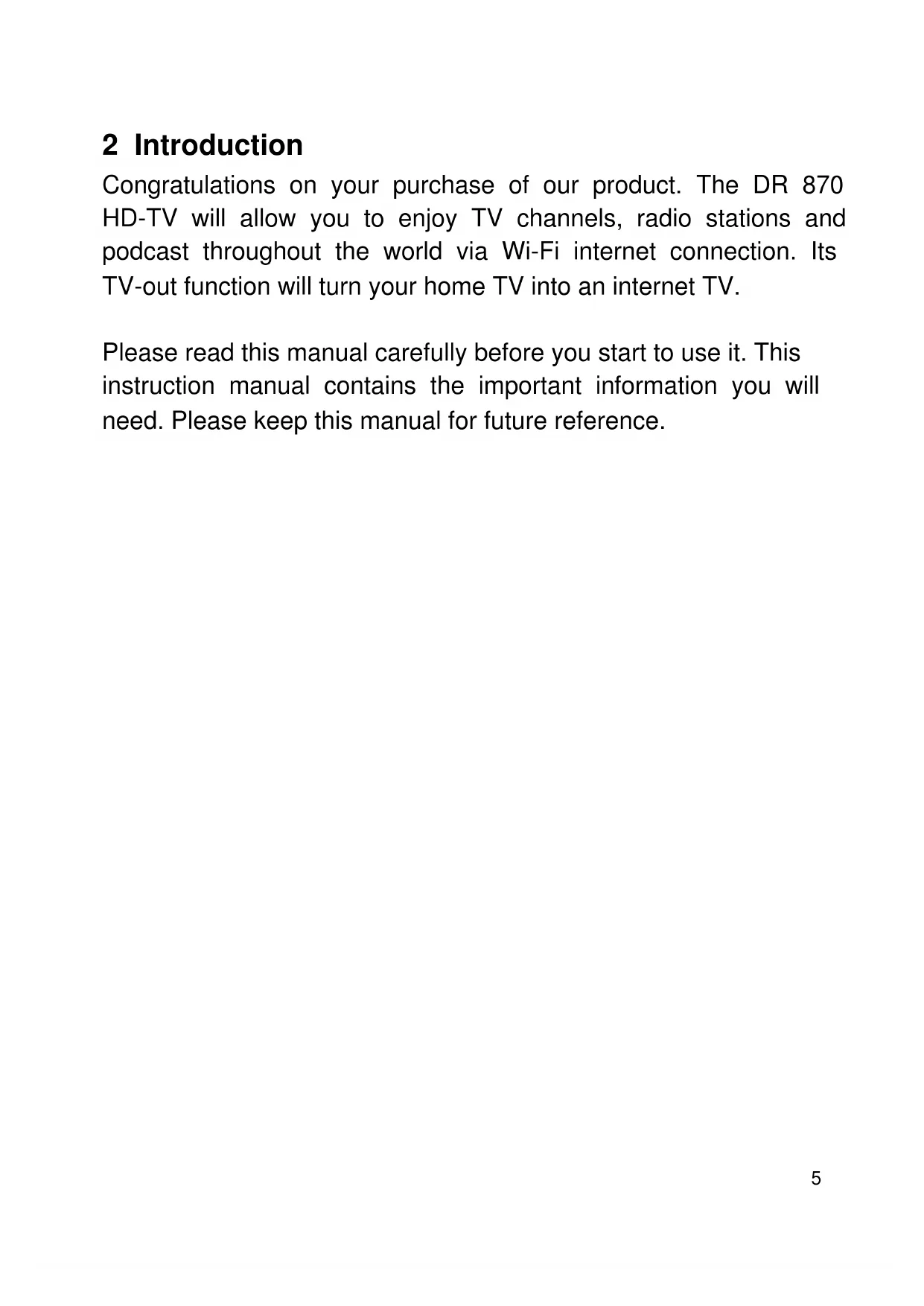Congratulations on your purchase of our product. The DR 870 HD-TV will allow you to enjoy TV channels, radio stations and podcast throughout the world via Wi-Fi internet connection. Its TV-out function will turn your home TV into an internet TV.