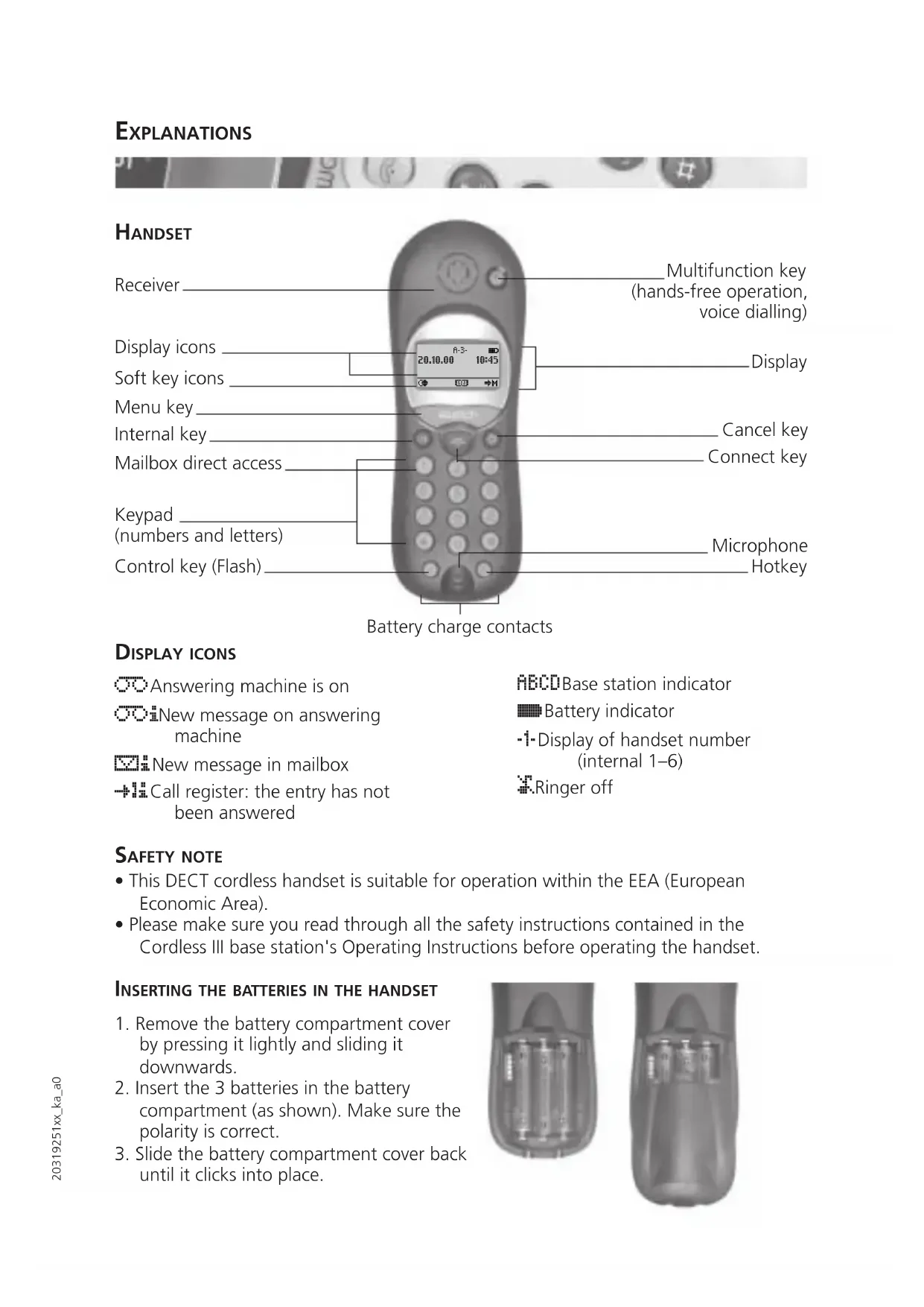GAP CORDLESS III COMFORT HANDSETCORDLESS III20319251xx_ka_a0 HANDSET Receiver Display Cancel key Microphone Battery charge contacts Connect key Menu key Keypad (numbers and letters) Display icons Hotkey Internal key Control key (Flash) ABCD Base station indicator a Battery indicator 1 Display of handset number (internal 1–6) u Ringer off Multifunction key (hands-free operation, voice dialling) Soft key icons Mailbox direct access EXPLANATIONS DISPLAY ICONS t Answering machine is on ti New message on answering machine i New message in mailbox p Call register: the entry has not been answered SAFETY NOTE