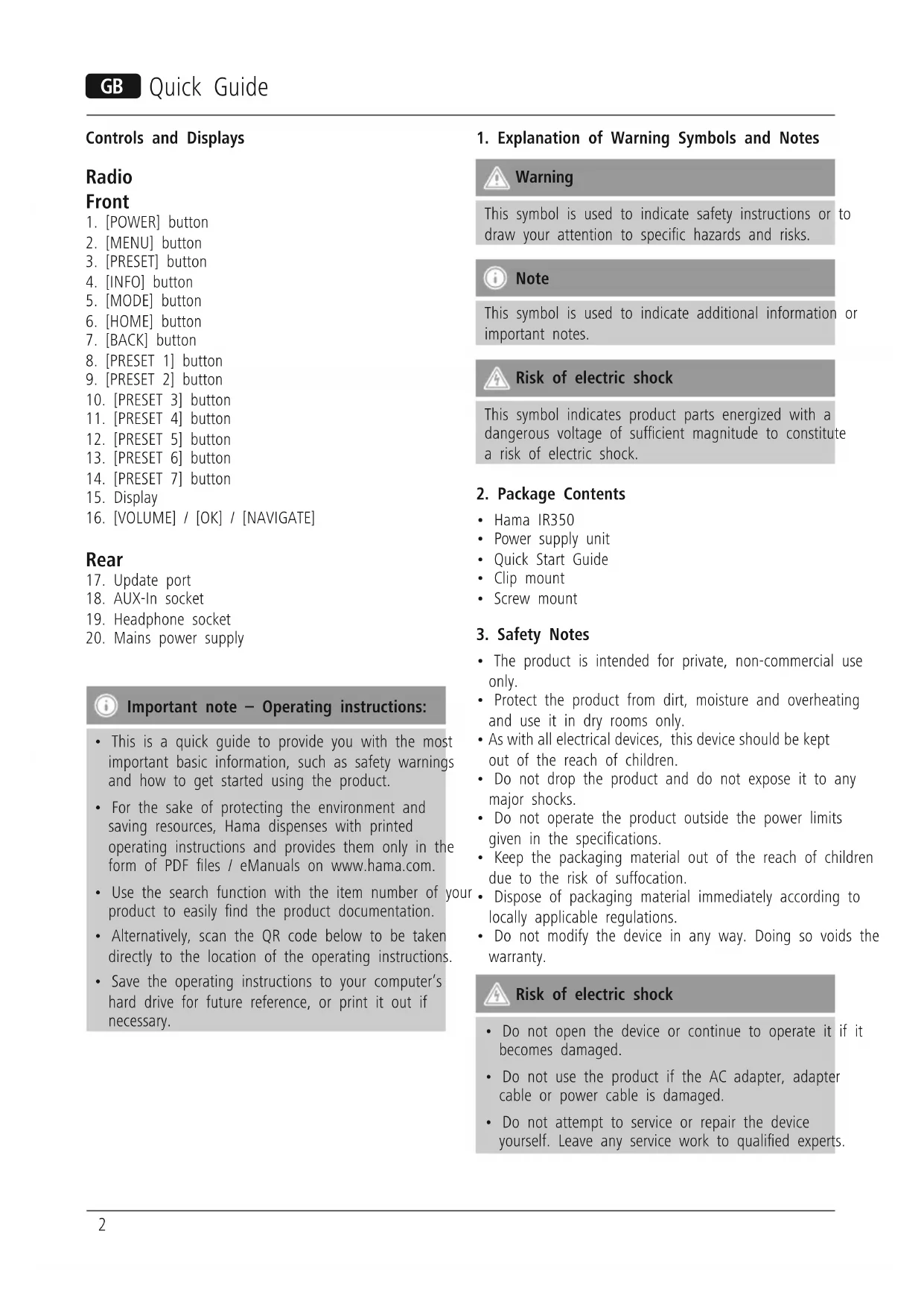 Download the instructions for your Radio in PDF format for free! Find your manual IR350 - HAMA and take your electronic device back in hand. On this page are published all the documents necessary for the use of your device. IR350 by HAMA.