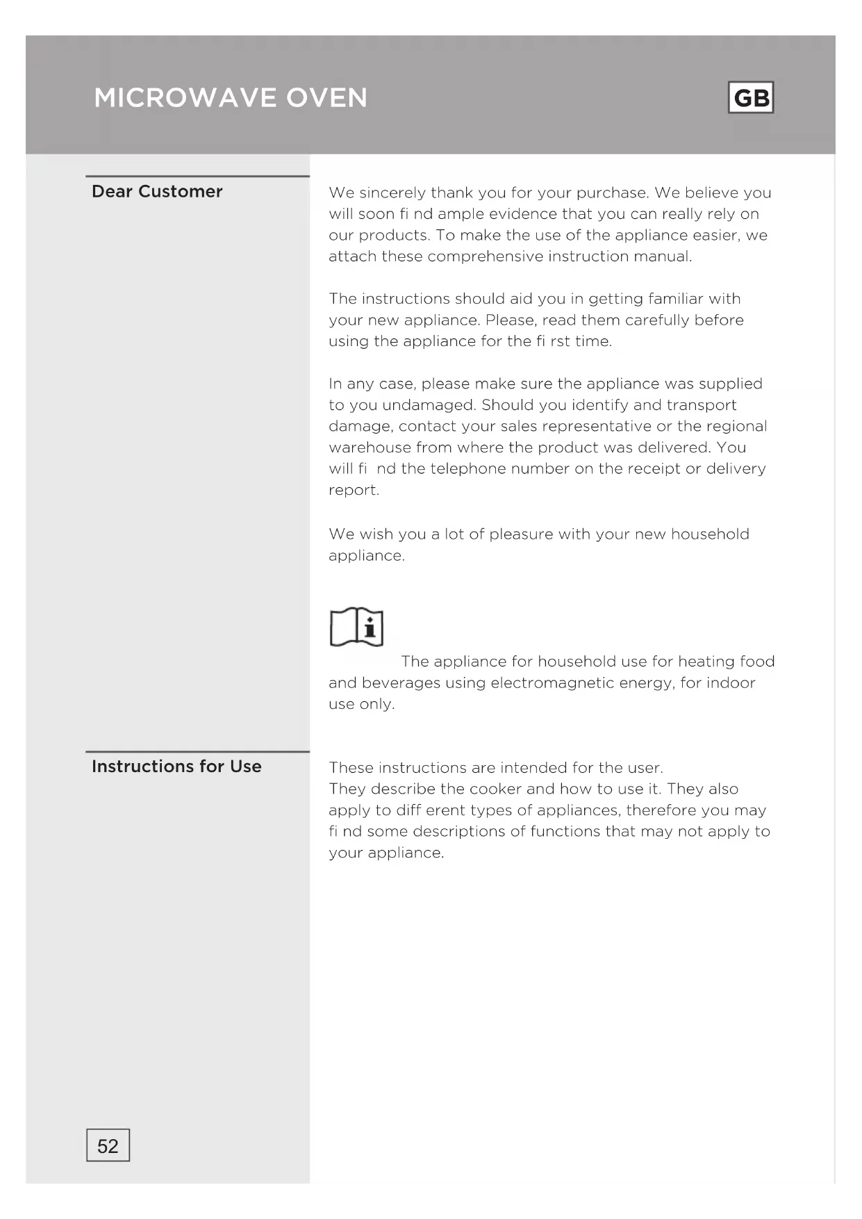 ПРЕД ДА ПОВИКАТЕ СЕРВИС ГАРАНЦИЈА И СЕРВИСWe sincerely thank you for your purchase. We believe you will soon fi nd ample evidence that you can really rely on our products. To make the use of the appliance easier, we attach these comprehensive instruction manual. The instructions should aid you in getting familiar with your new appliance. Please, read them carefully before using the appliance for the fi rst time. In any case, please make sure the appliance was supplied to you undamaged. Should you identify and transport damage, contact your sales representative or the regional warehouse from where the product was delivered. You will fi nd the telephone number on the receipt or delivery report. We wish you a lot of pleasure with your new household appliance. The appliance for household use for heating food and beverages using electromagnetic energy, for indoor use only. These instructions are intended for the user. They describe the cooker and how to use it. They also apply to di erent types of appliances, therefore you may fi nd some descriptions of functions that may not apply to your appliance. Instructions for Use Dear Customer